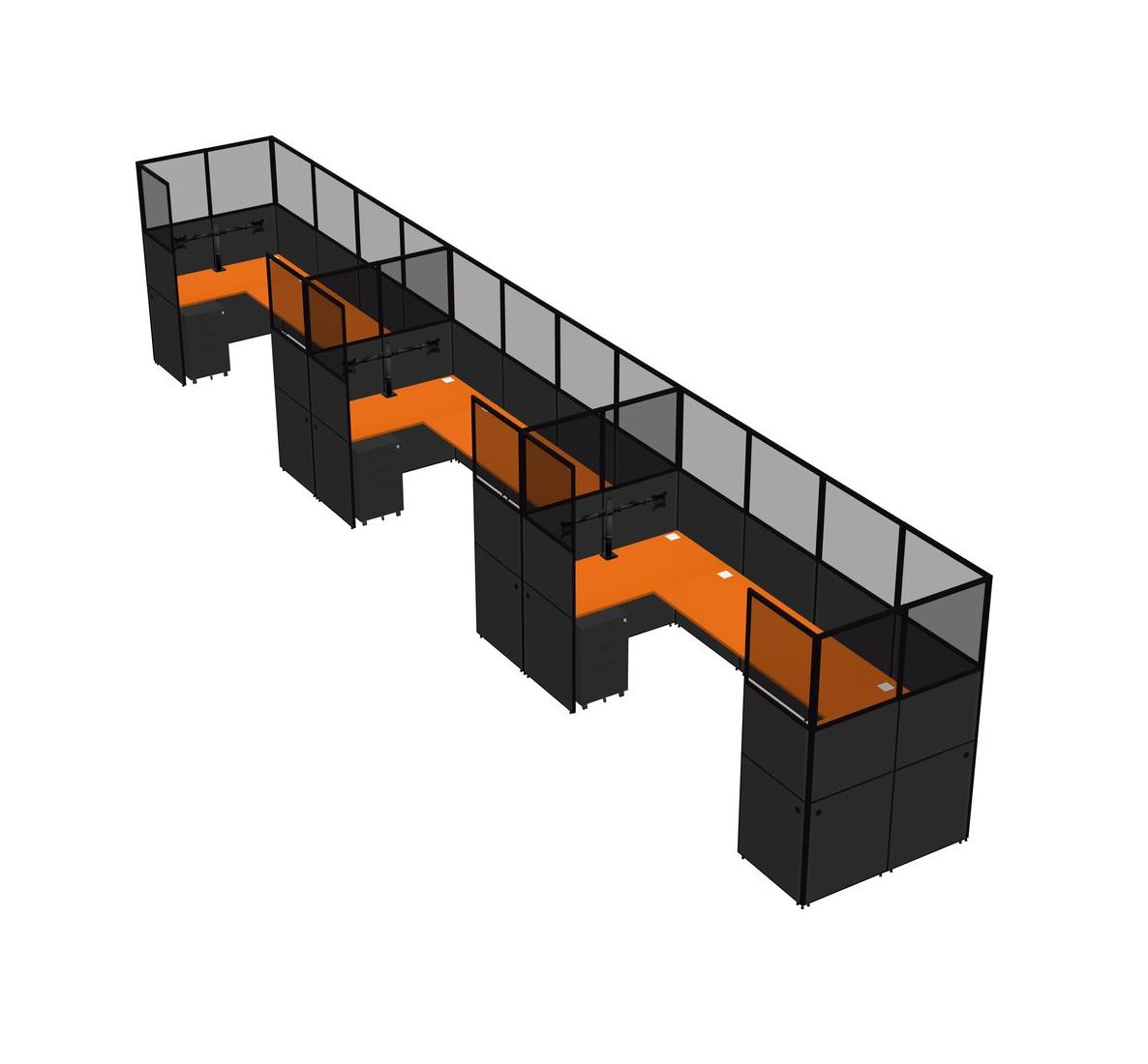Orange U-shaped Panel System For 3 Person + Monitor Arm (double Arms) + Metal Mobile Drawers For 3 User(s)