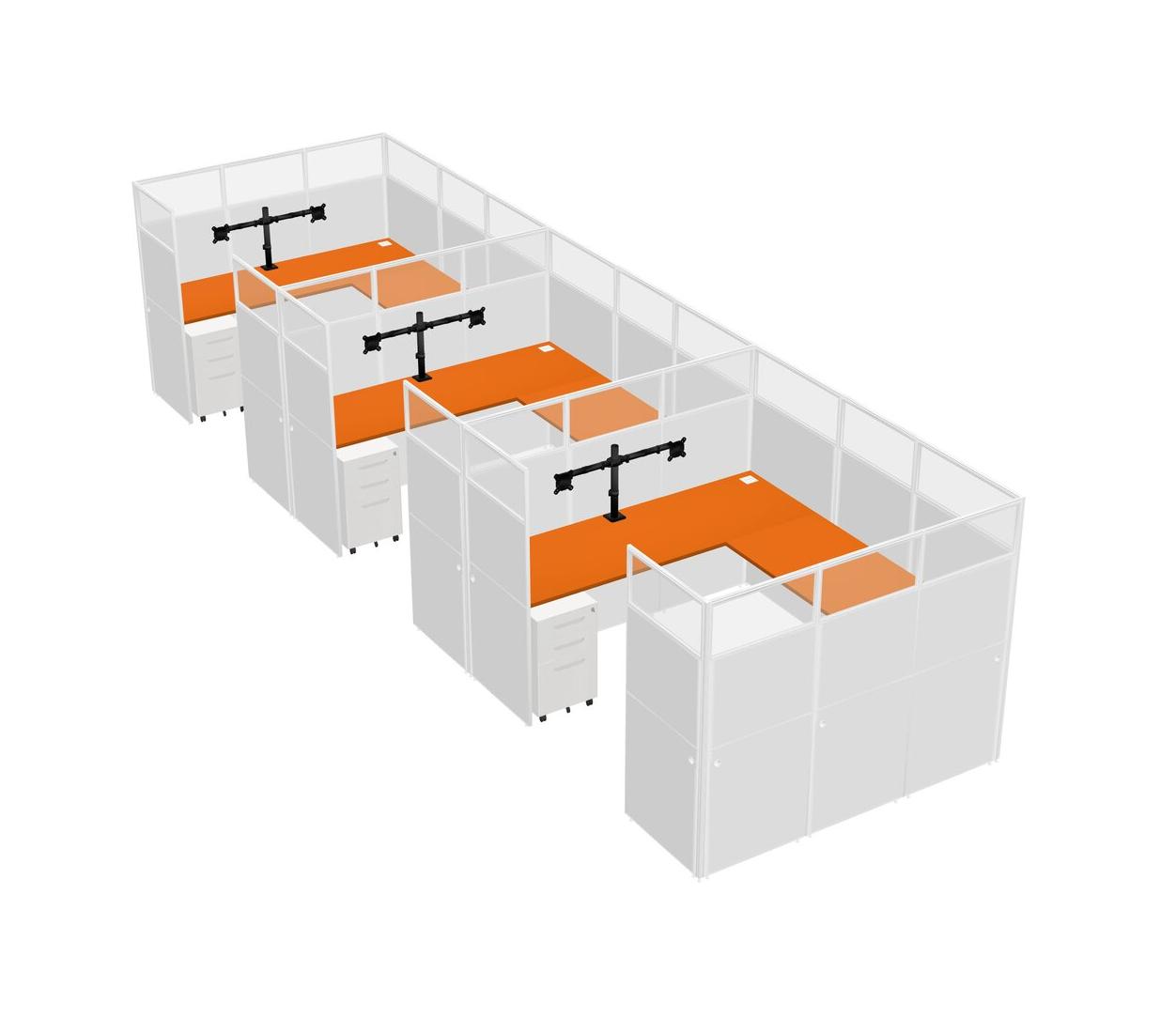 Orange U-shaped Panel System For 3 Person + Monitor Arm (double Arms) + Metal Mobile Drawers For 3 User(s)
