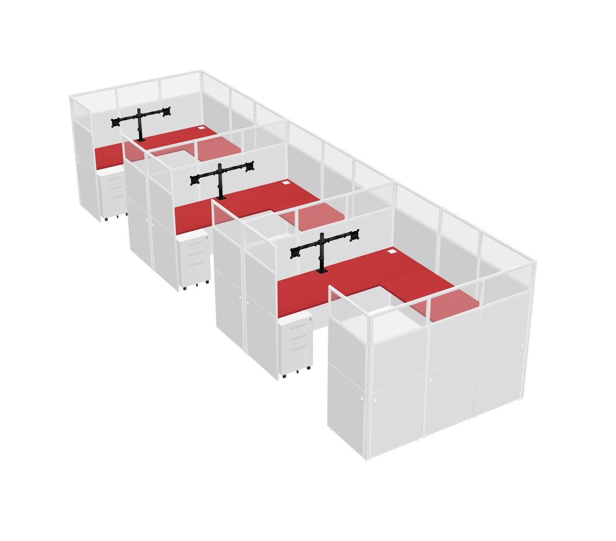 Prism Red U-shaped Panel System For 3 Person + Monitor Arm (double Arms) + Metal Mobile Drawers For 3 User(s)