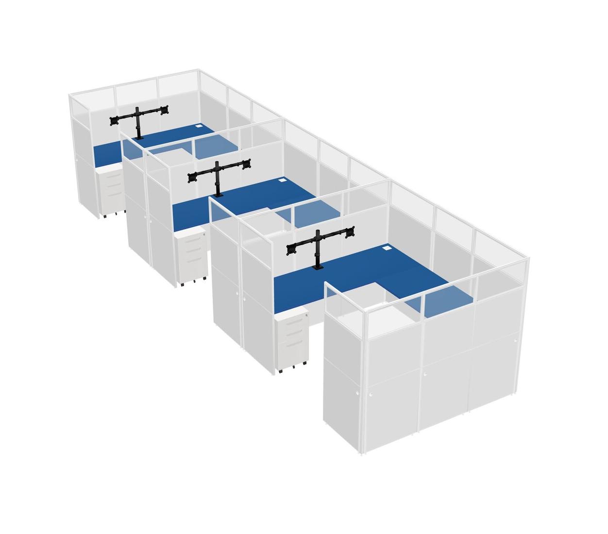 Prism Blue U-shaped Panel System For 3 Person + Monitor Arm (double Arms) + Metal Mobile Drawers For 3 User(s)