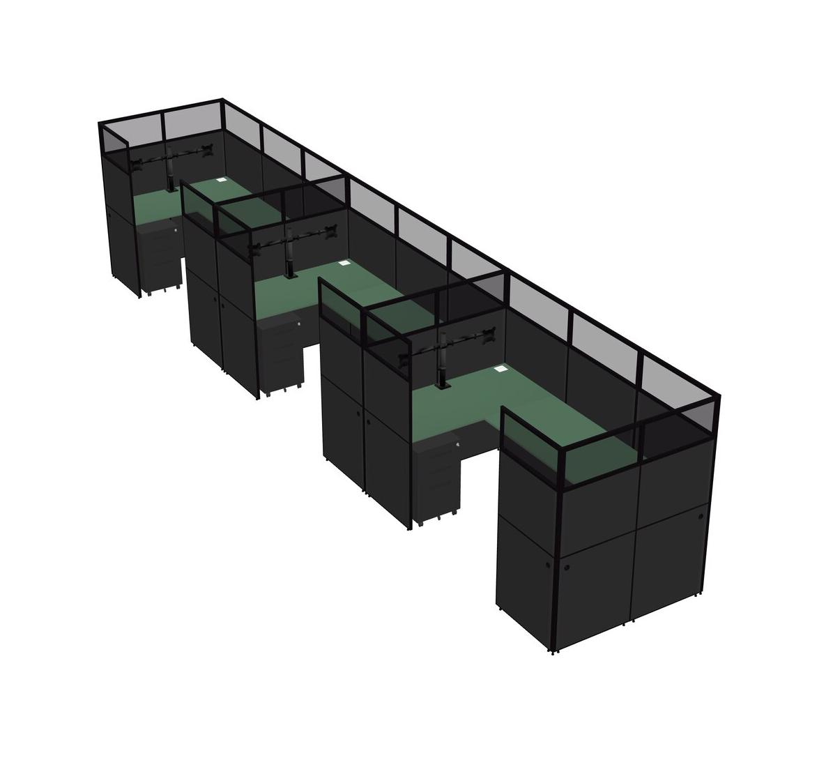 Green U-shaped Panel System For 3 Person + Monitor Arm (double Arms) + Metal Mobile Drawers For 3 User(s)
