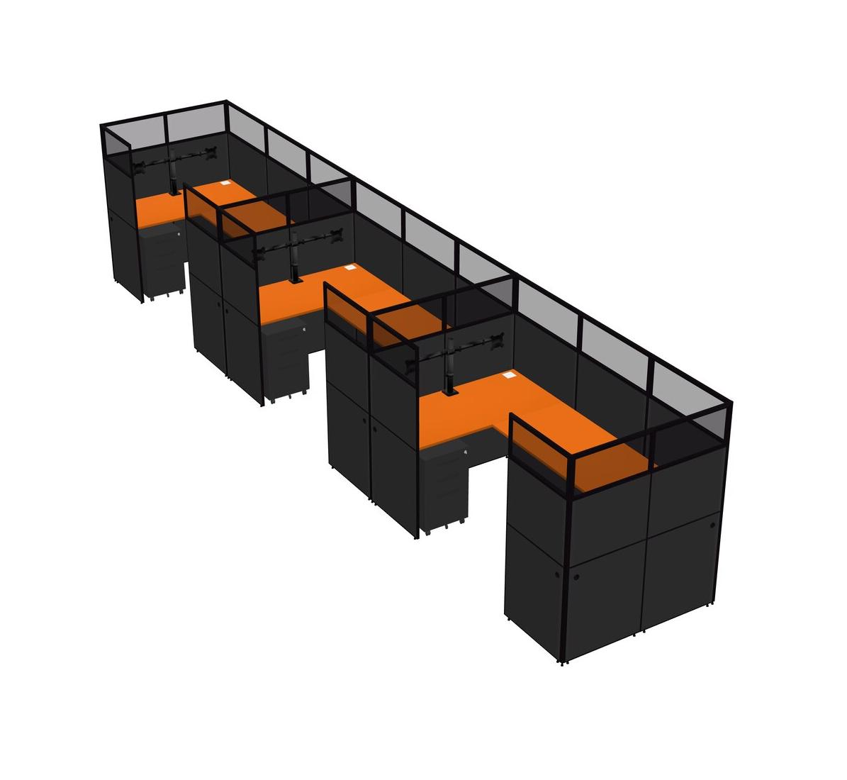 Orange U-shaped Panel System For 3 Person + Monitor Arm (double Arms) + Metal Mobile Drawers For 3 User(s)