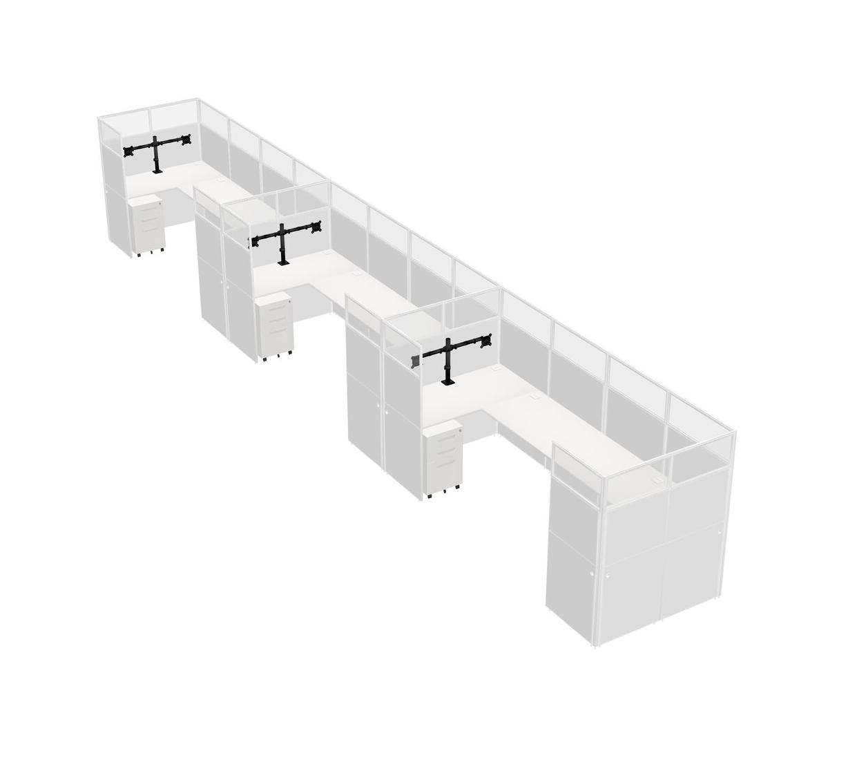 White U-shaped Panel System For 3 Person + Monitor Arm (double Arms) + Metal Mobile Drawers For 3 User(s)