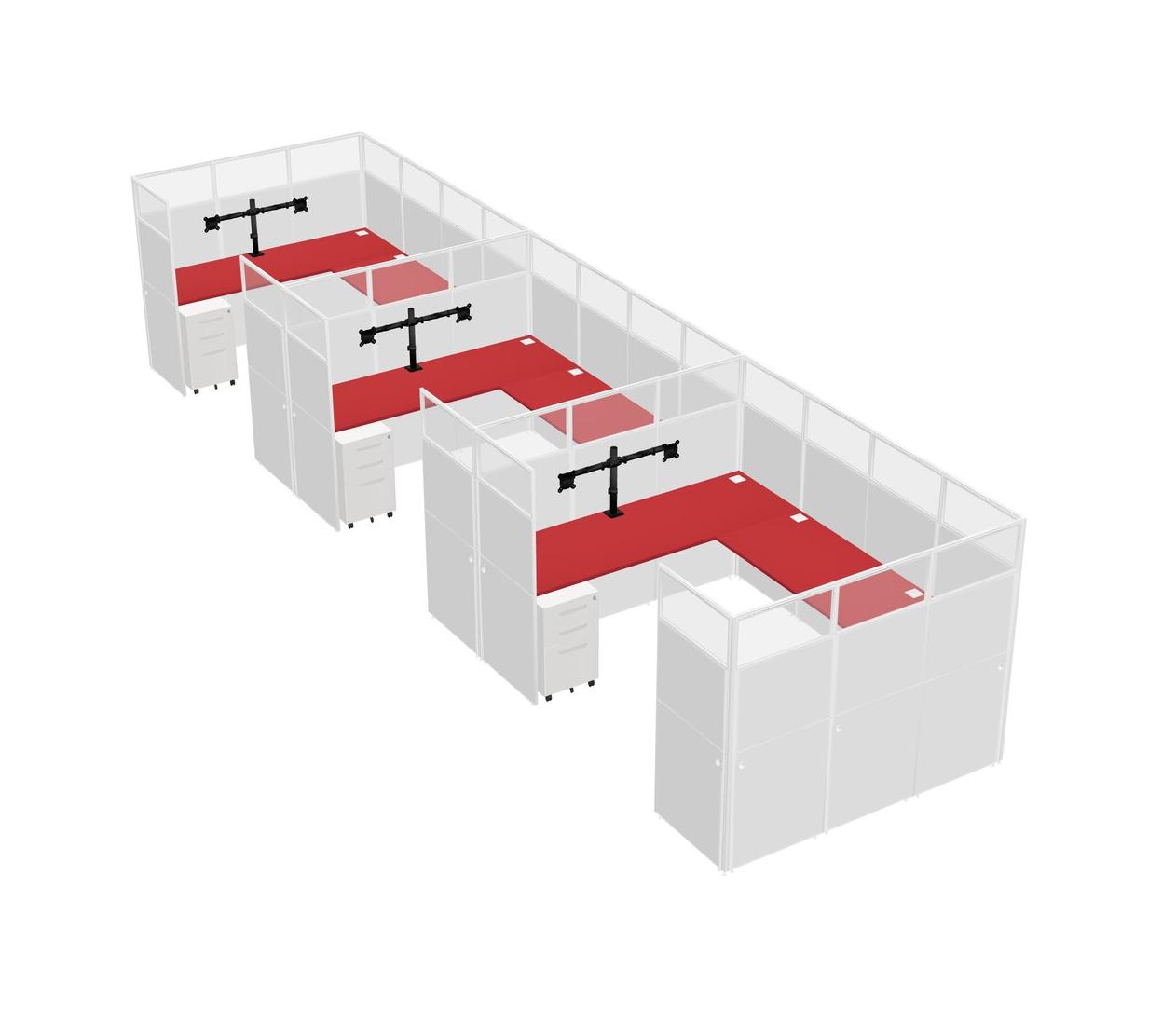 Prism Red U-shaped Panel System For 3 Person + Monitor Arm (double Arms) + Metal Mobile Drawers For 3 User(s)