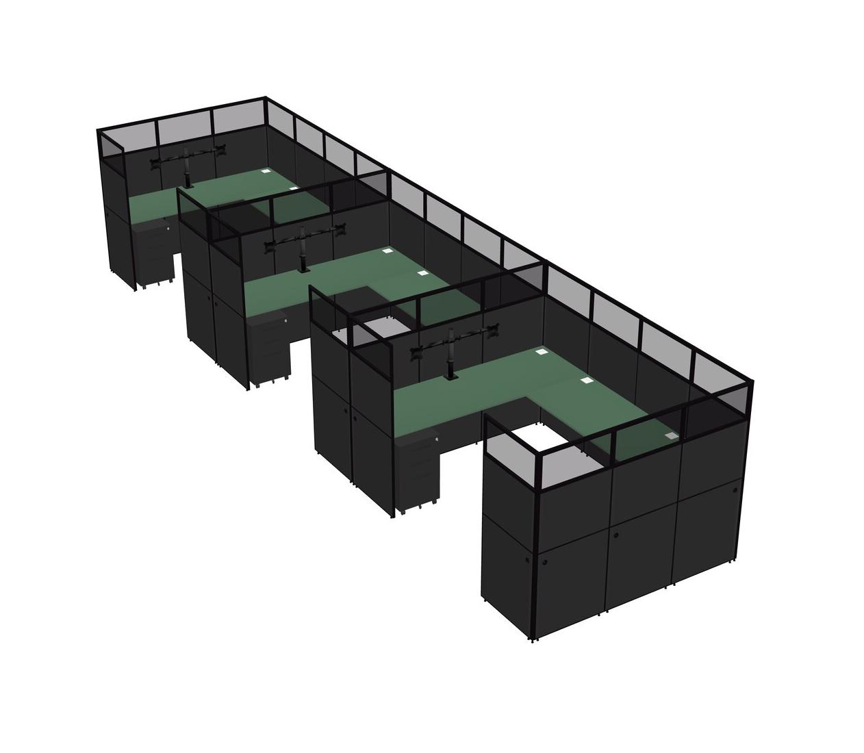 Green U-shaped Panel System For 3 Person + Monitor Arm (double Arms) + Metal Mobile Drawers For 3 User(s)