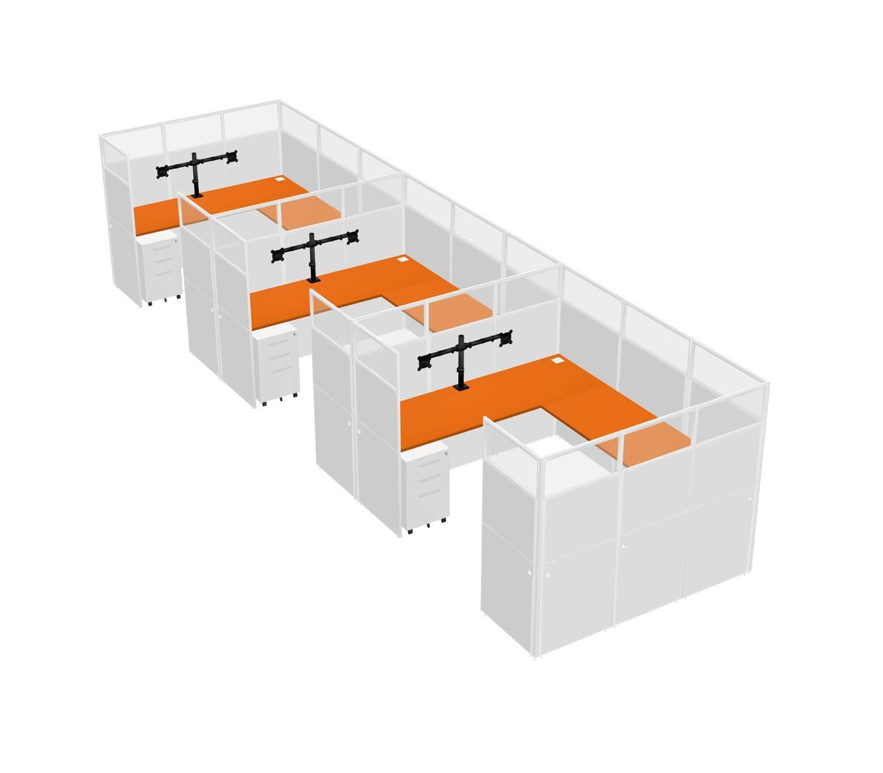 Orange U-shaped Panel System For 3 Person + Monitor Arm (double Arms) + Metal Mobile Drawers For 3 User(s)