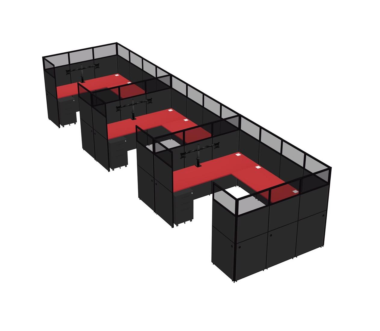 Prism Red U-shaped Panel System For 3 Person + Monitor Arm (double Arms) + Metal Mobile Drawers For 3 User(s)