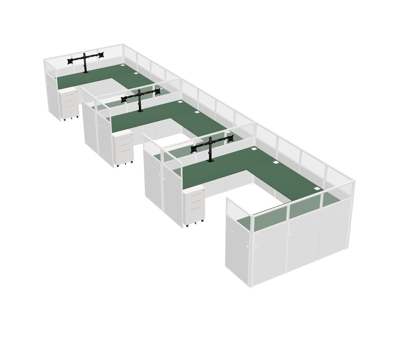 Green U-shaped Panel System For 3 Person + Monitor Arm (double Arms) + Metal Mobile Drawers For 3 User(s)