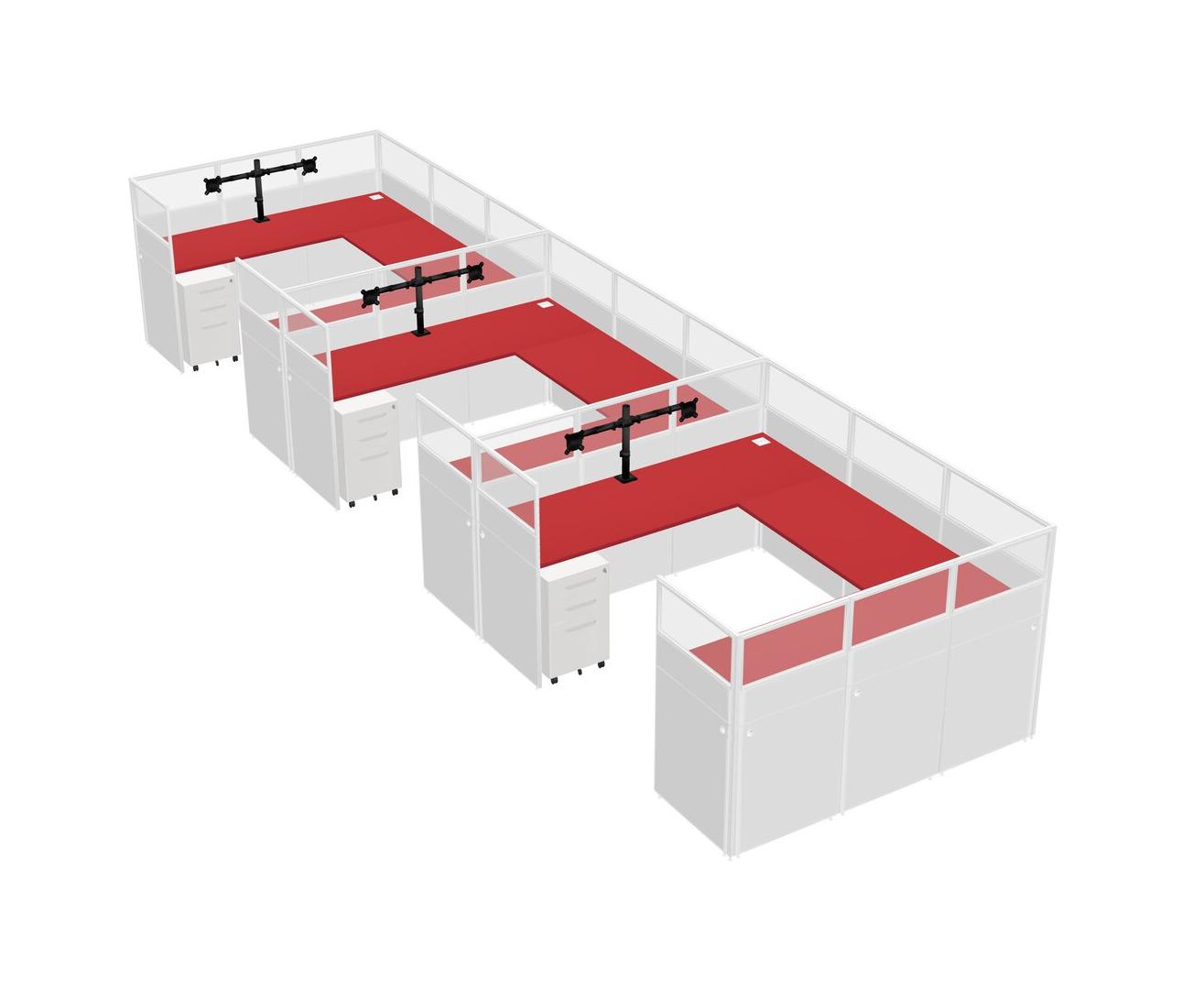 Prism Red U-shaped Panel System For 3 Person + Monitor Arm (double Arms) + Metal Mobile Drawers For 3 User(s)