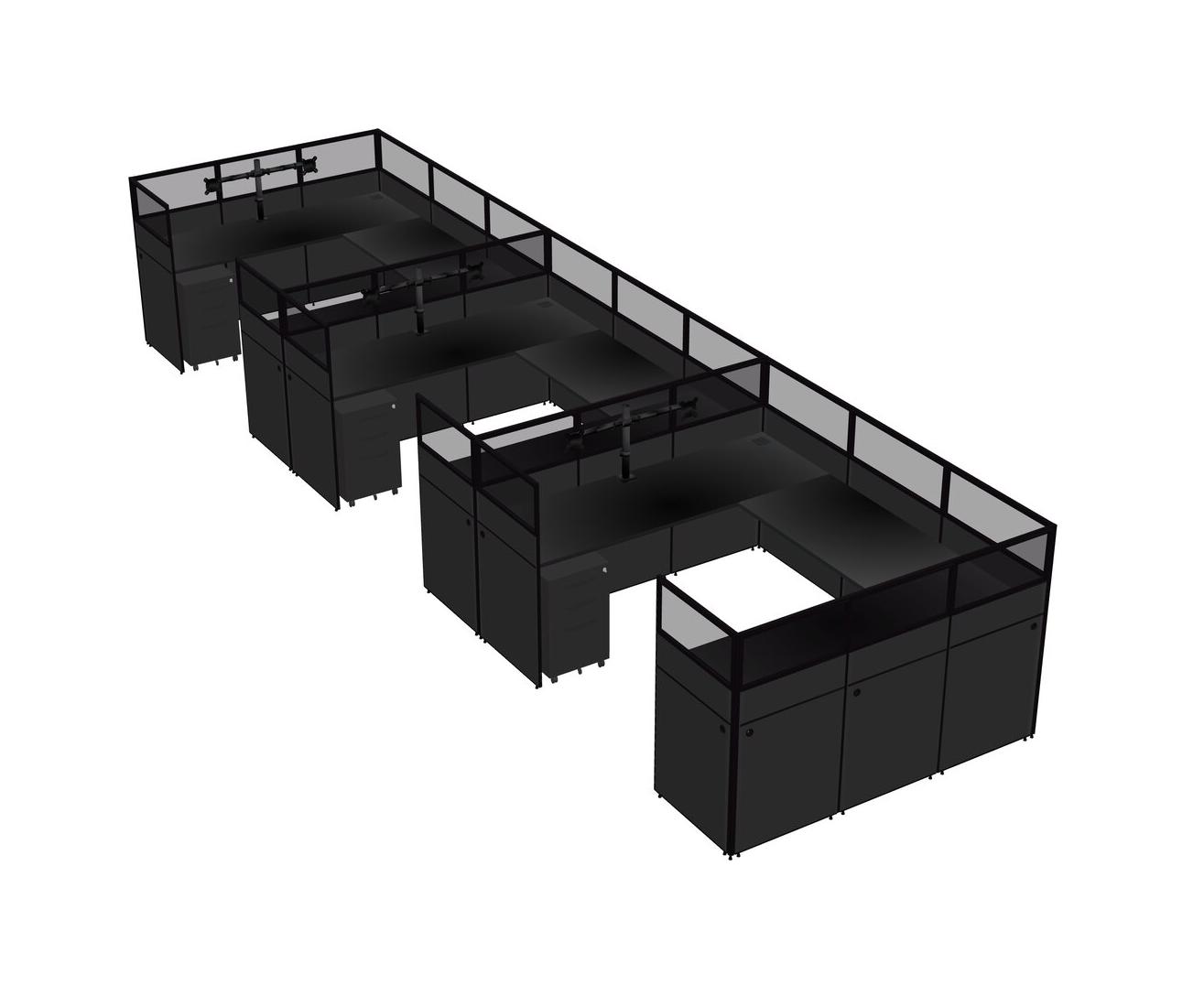 Black U-shaped Panel System For 3 Person + Monitor Arm (double Arms) + Metal Mobile Drawers For 3 User(s)