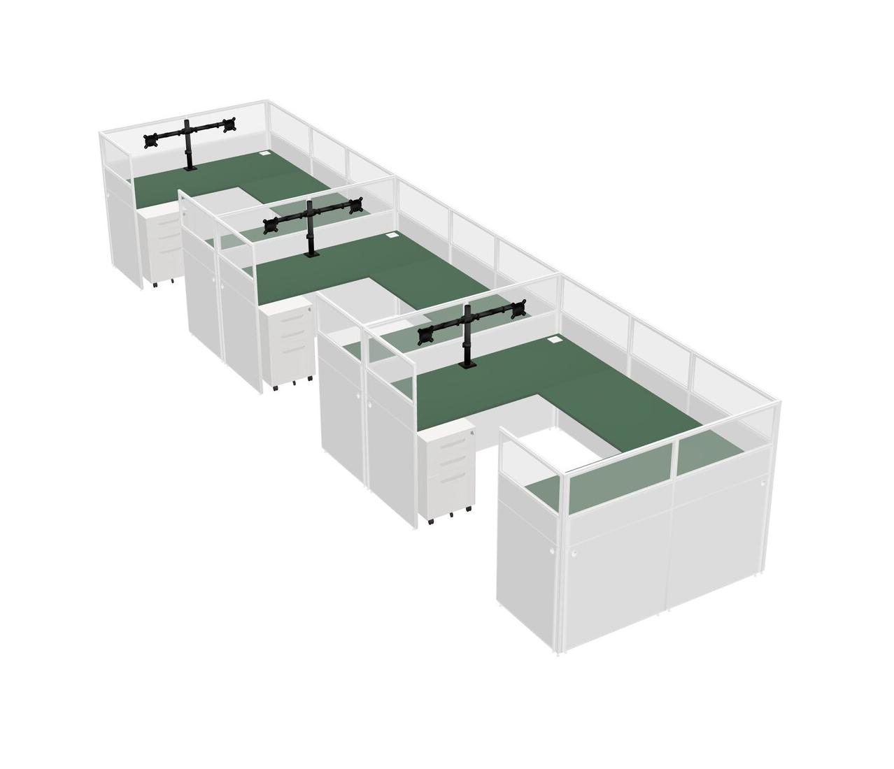 Green U-shaped Panel System For 3 Person + Monitor Arm (double Arms) + Metal Mobile Drawers For 3 User(s)