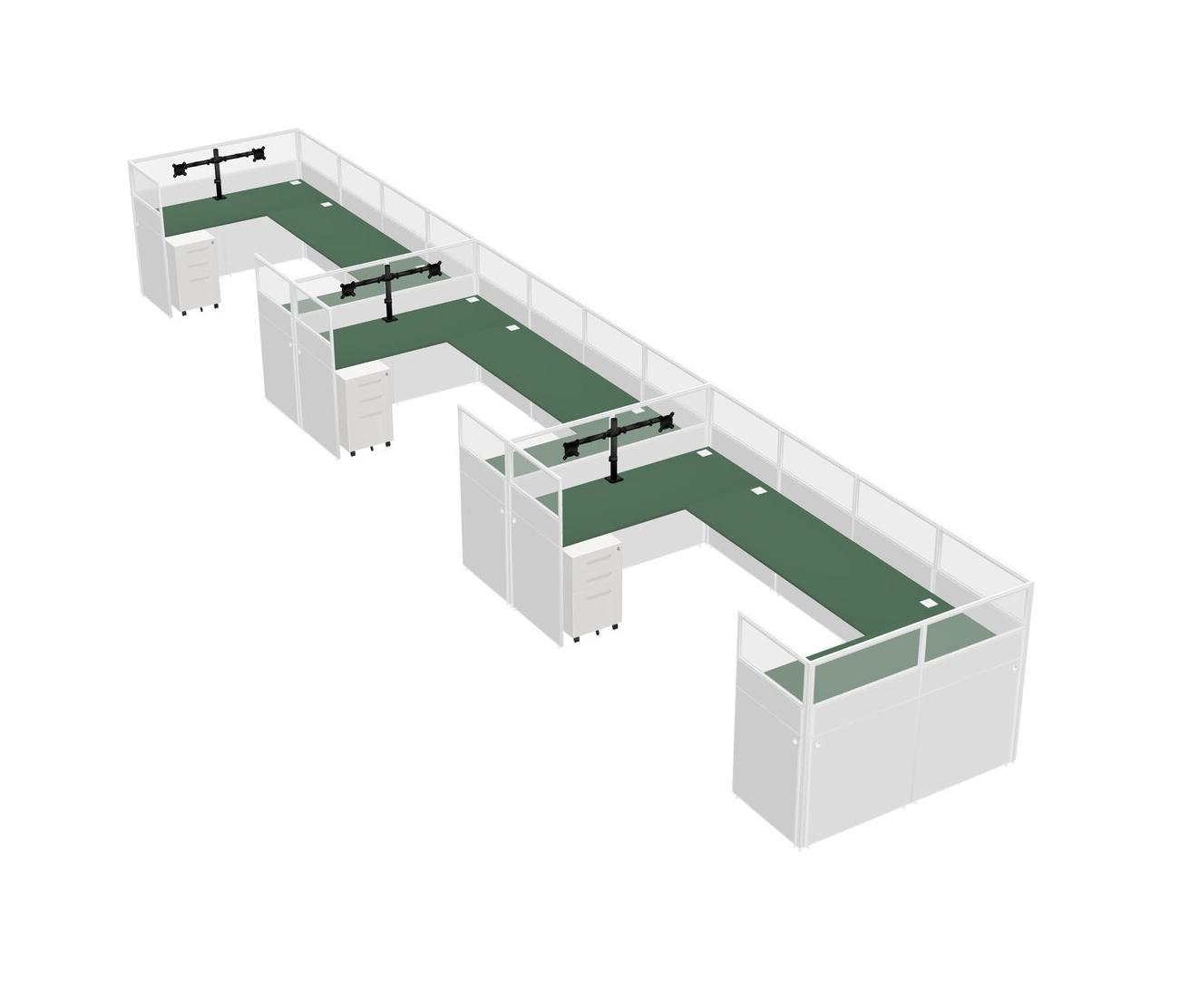Green U-shaped Panel System For 3 Person + Monitor Arm (double Arms) + Metal Mobile Drawers For 3 User(s)