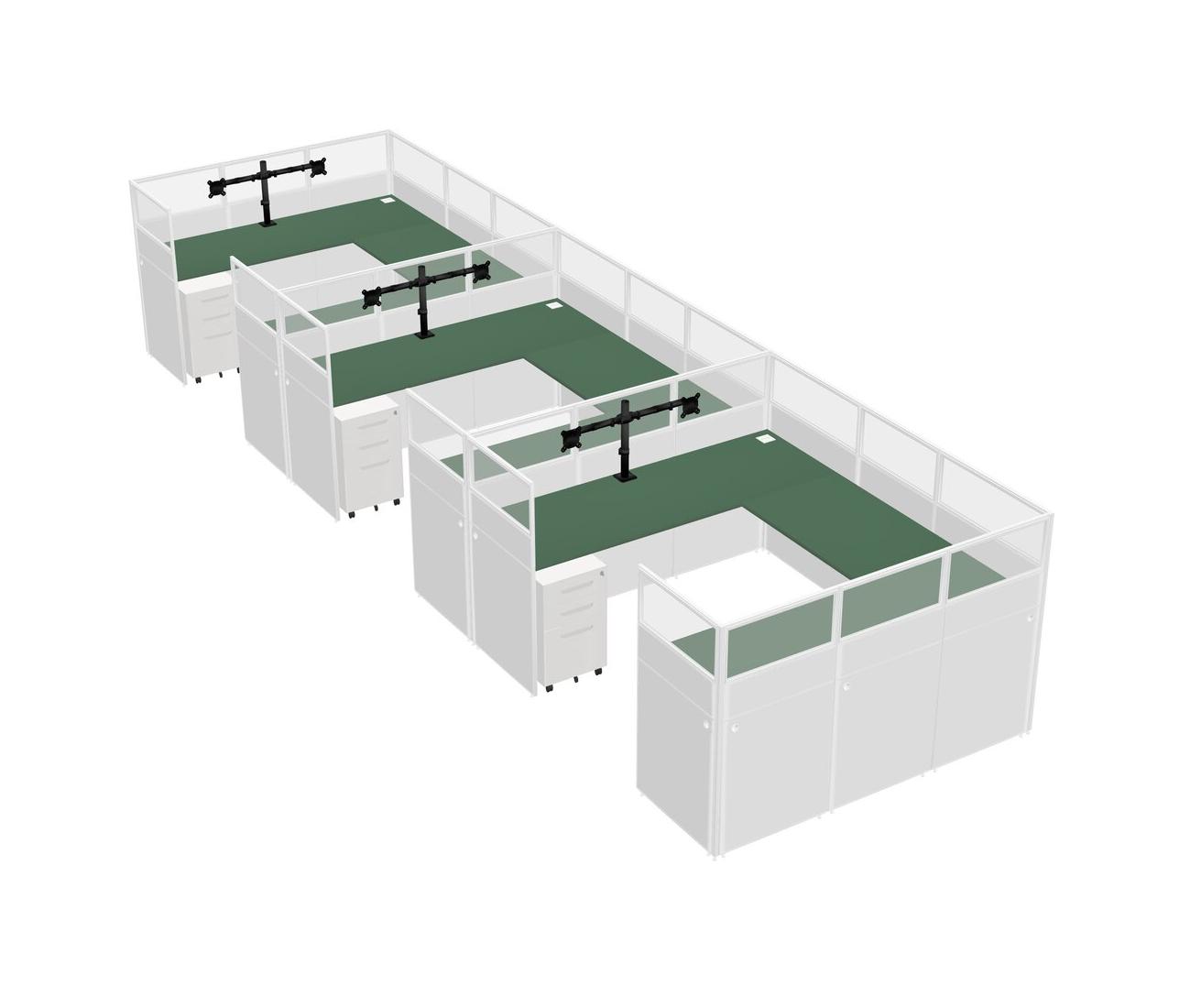 Green U-shaped Panel System For 3 Person + Monitor Arm (double Arms) + Metal Mobile Drawers For 3 User(s)