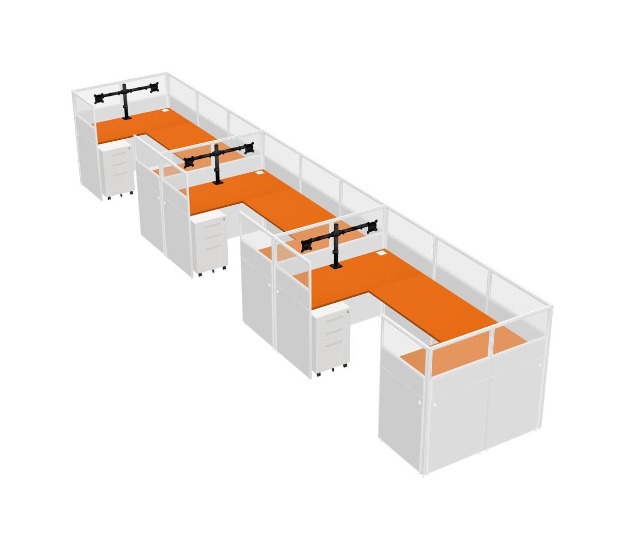 Orange U-shaped Panel System For 3 Person + Monitor Arm (double Arms) + Metal Mobile Drawers For 3 User(s)