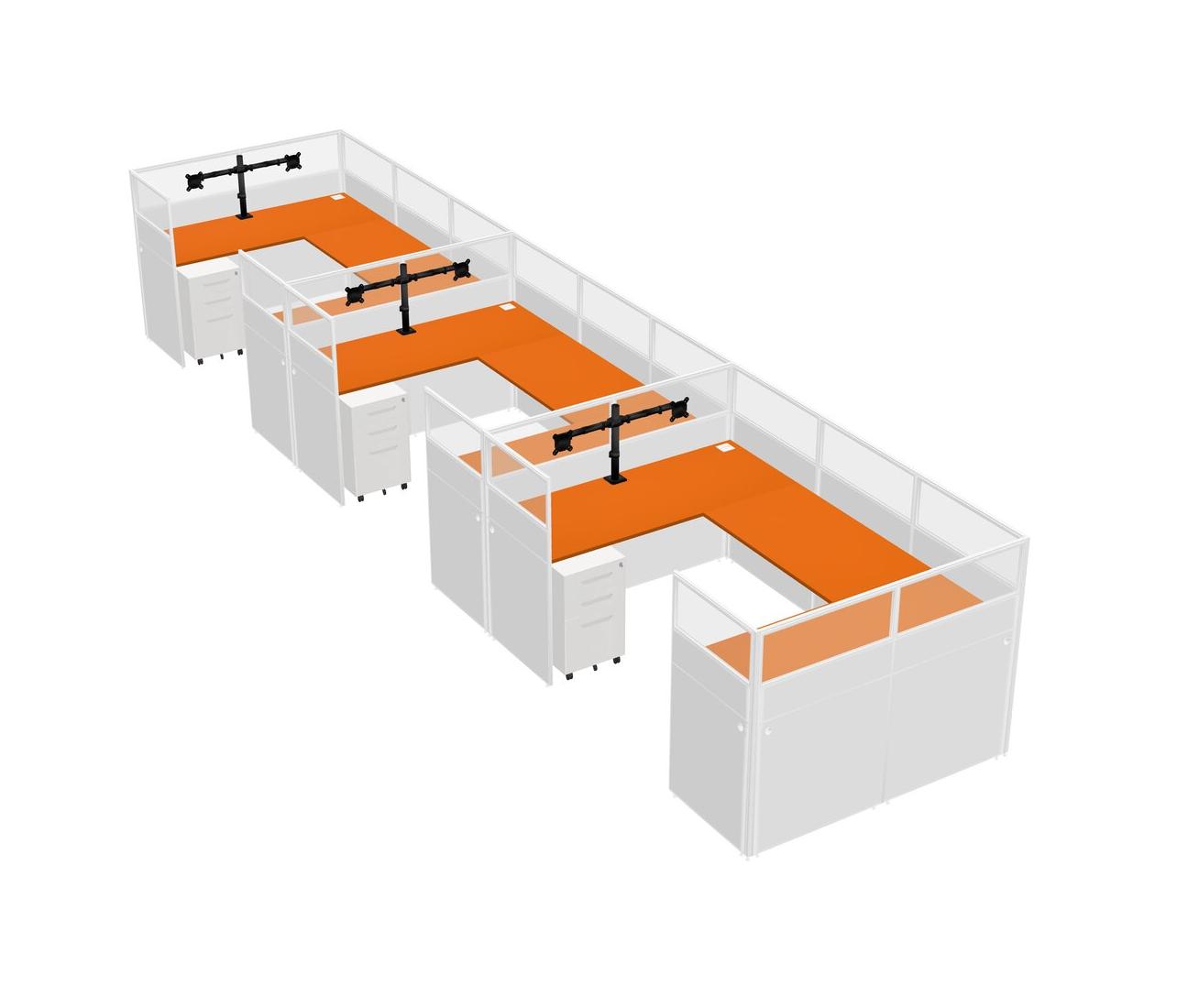 Orange U-shaped Panel System For 3 Person + Monitor Arm (double Arms) + Metal Mobile Drawers For 3 User(s)