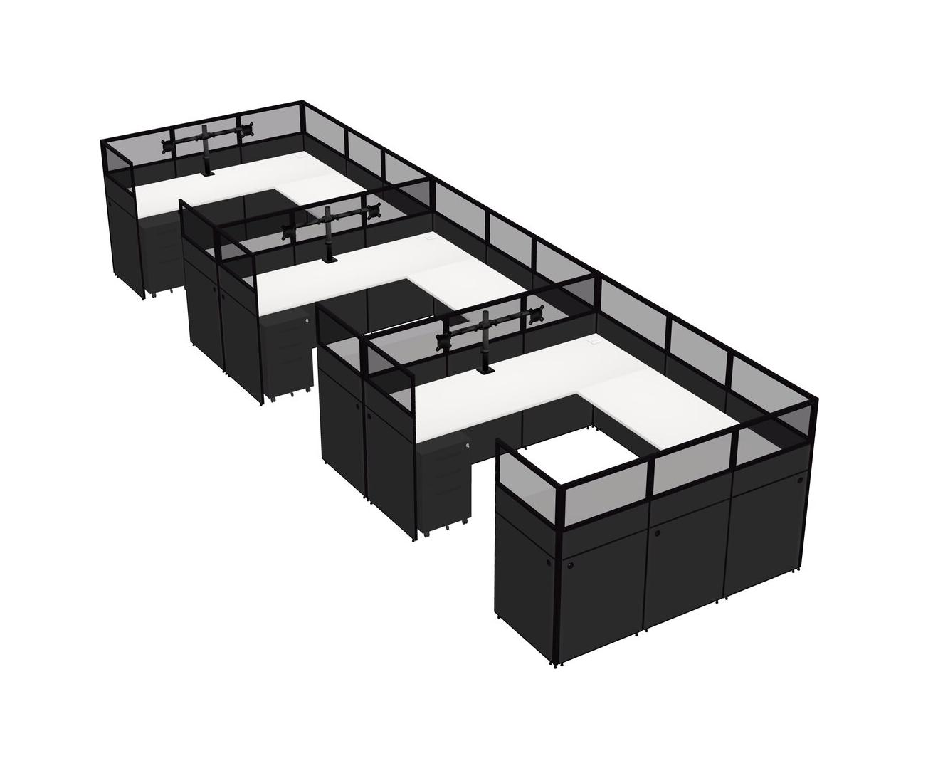 White U-shaped Panel System For 3 Person + Monitor Arm (double Arms) + Metal Mobile Drawers For 3 User(s)