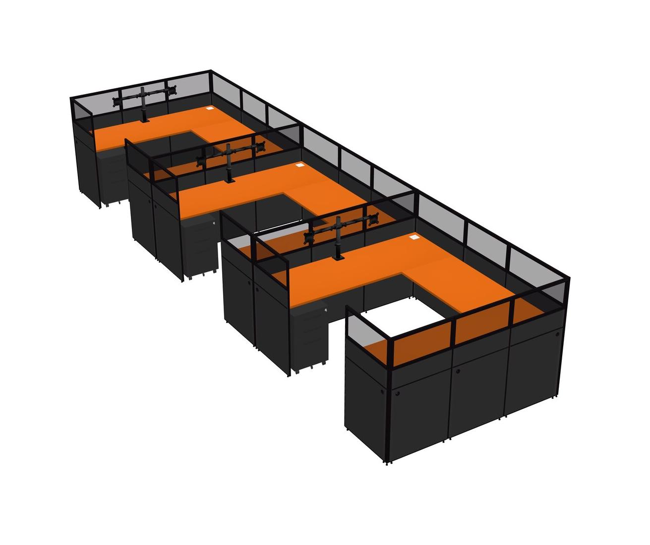 Orange U-shaped Panel System For 3 Person + Monitor Arm (double Arms) + Metal Mobile Drawers For 3 User(s)