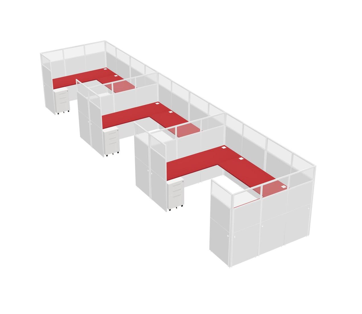Prism Red U-shaped Panel System For 3 Person + Metal Mobile Drawers For 3 User(s)