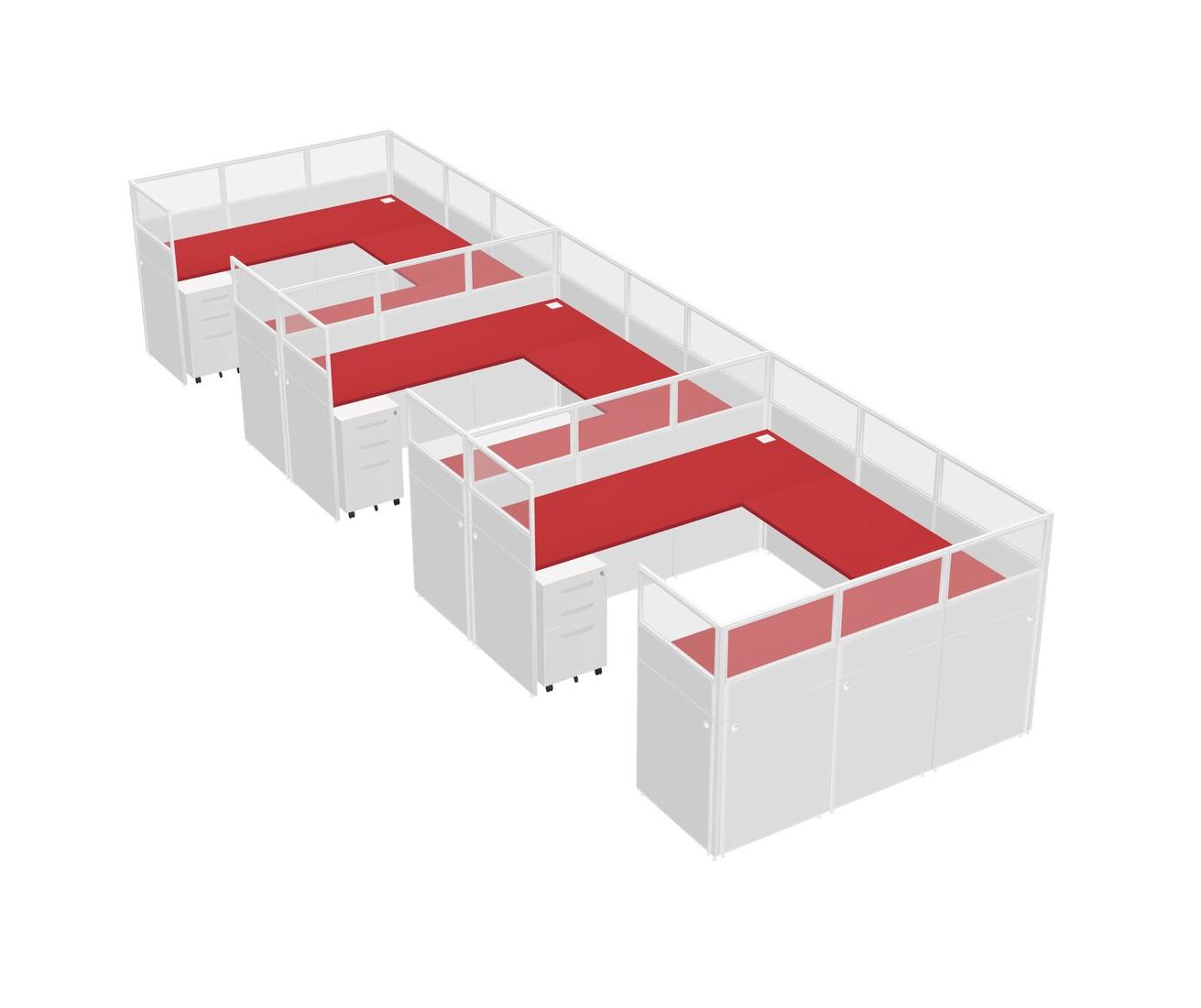 Prism Red U-shaped Panel System For 3 Person + Metal Mobile Drawers For 3 User(s)