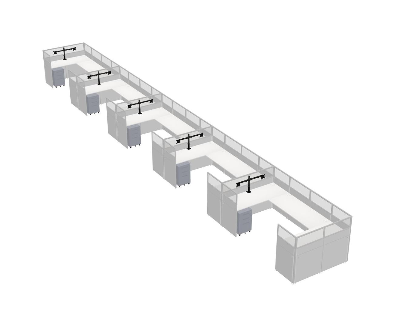 White U-shaped Panel System For 5 Person + Monitor Arm (double Arms) + Metal Mobile Drawers For 5 User(s)