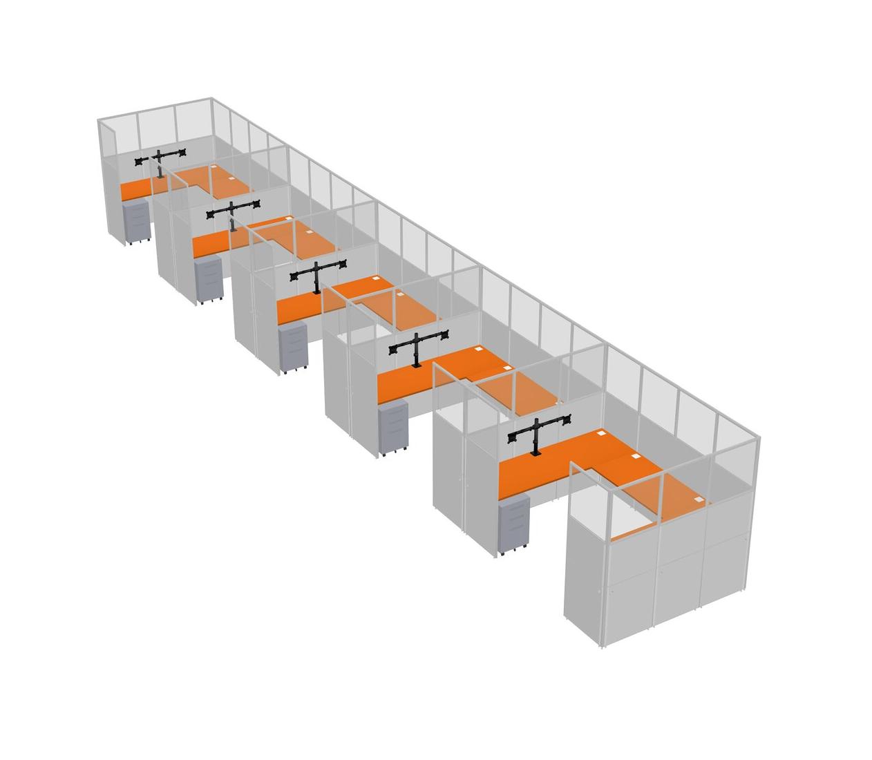 Orange U-shaped Panel System For 5 Person + Monitor Arm (double Arms) + Metal Mobile Drawers For 5 User(s)