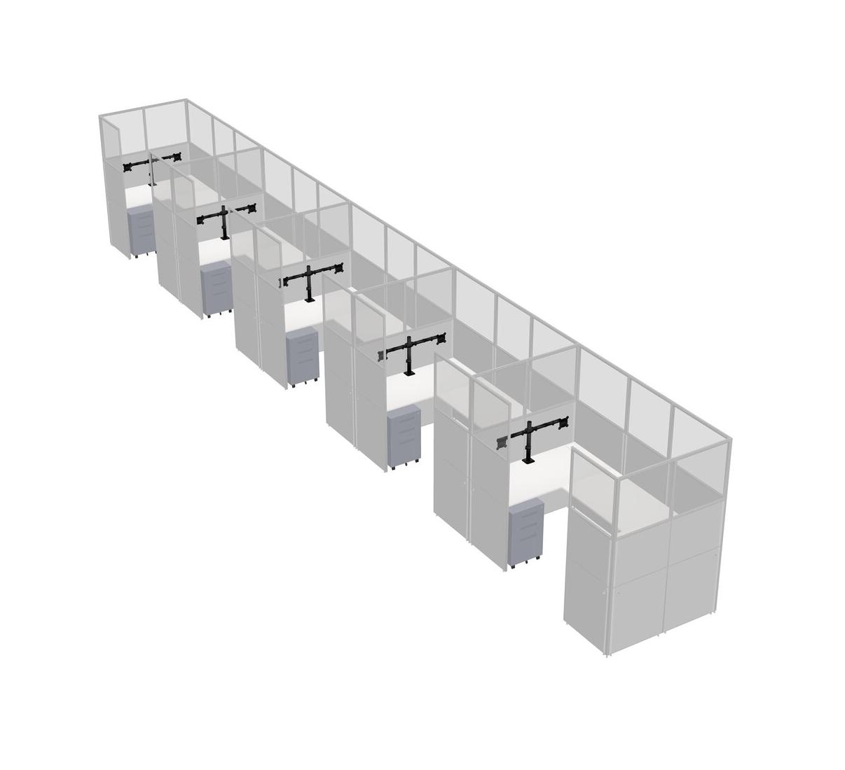 White U-shaped Panel System For 5 Person + Monitor Arm (double Arms) + Metal Mobile Drawers For 5 User(s)