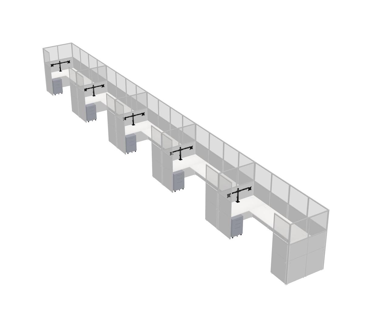 White U-shaped Panel System For 5 Person + Monitor Arm (double Arms) + Metal Mobile Drawers For 5 User(s)