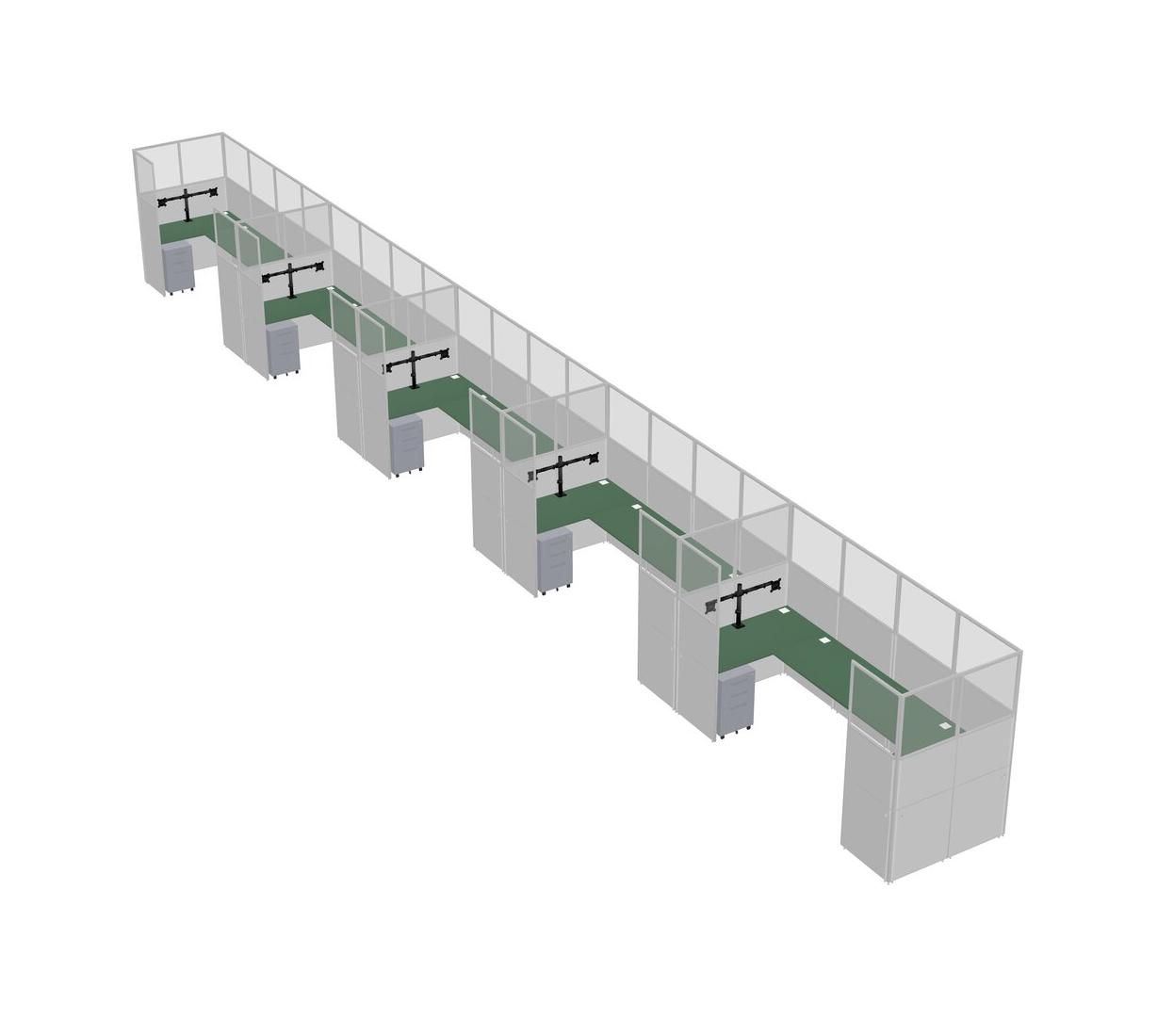 Green U-shaped Panel System For 5 Person + Monitor Arm (double Arms) + Metal Mobile Drawers For 5 User(s)