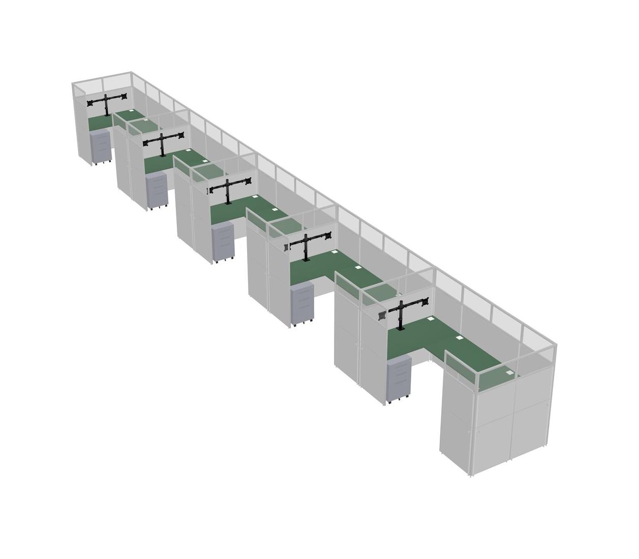 Green U-shaped Panel System For 5 Person + Monitor Arm (double Arms) + Metal Mobile Drawers For 5 User(s)