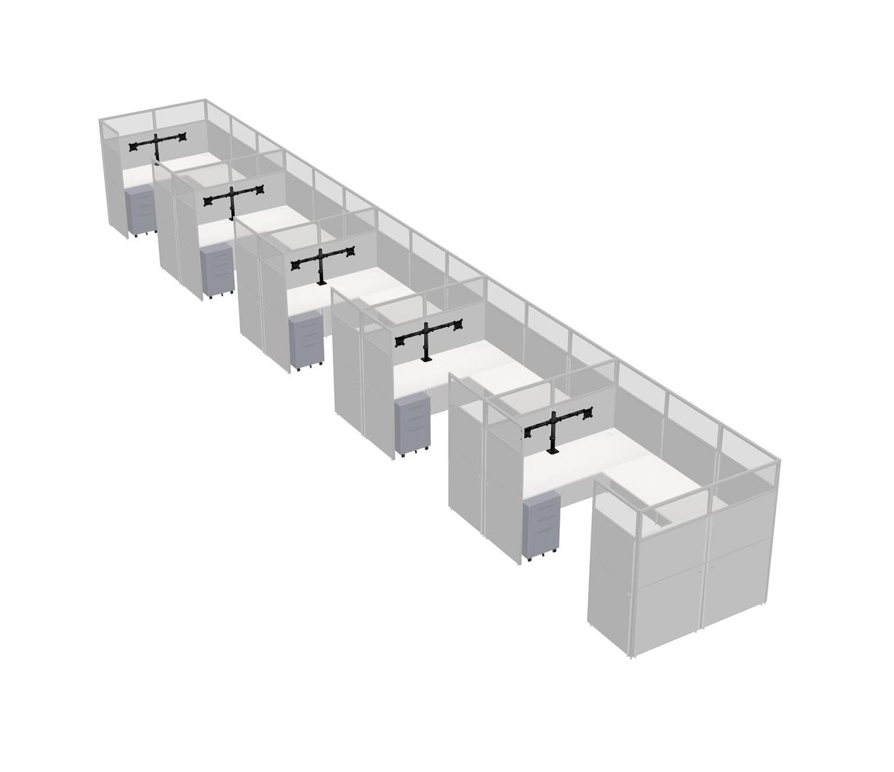 White U-shaped Panel System For 5 Person + Monitor Arm (double Arms) + Metal Mobile Drawers For 5 User(s)