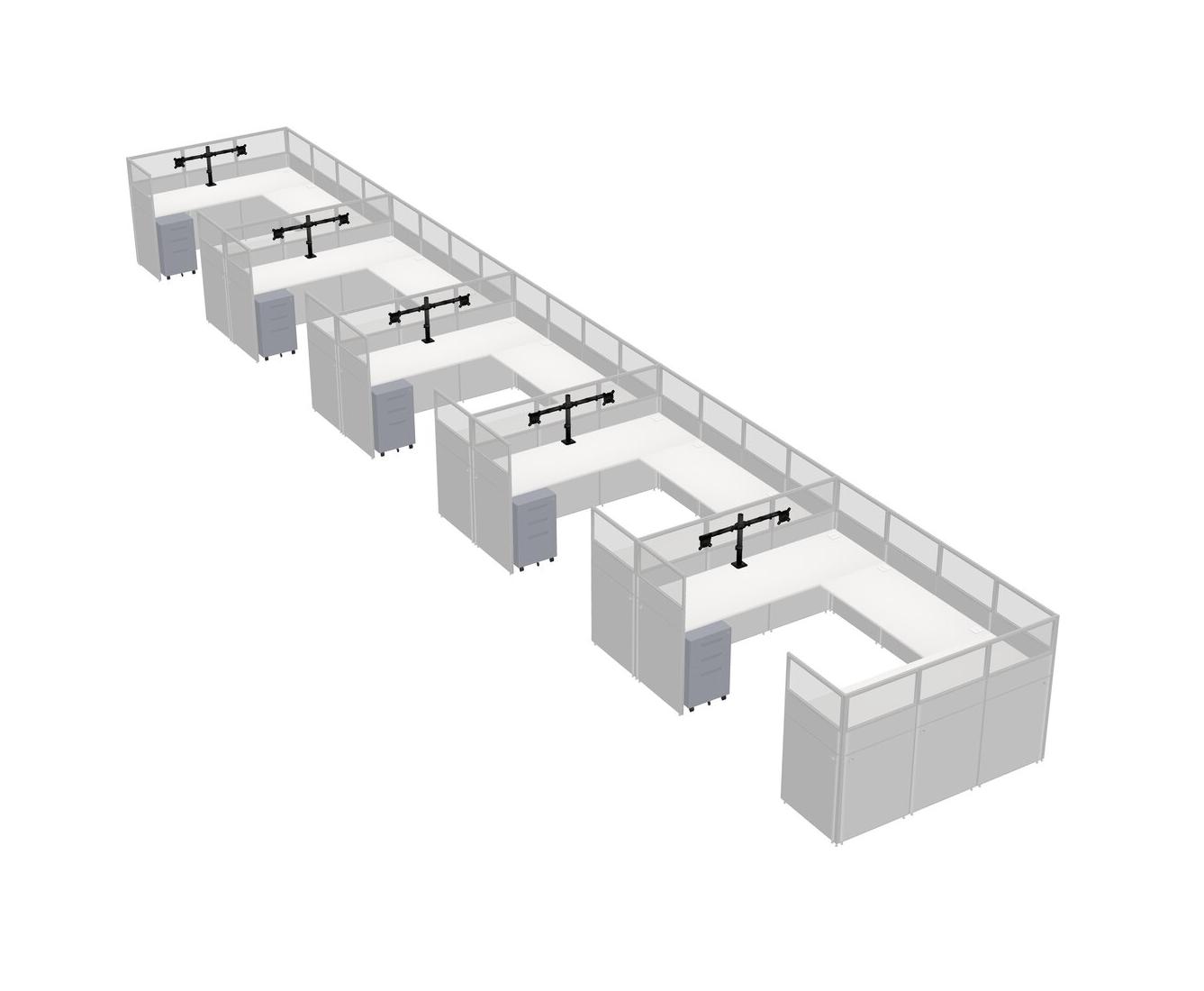 White U-shaped Panel System For 5 Person + Monitor Arm (double Arms) + Metal Mobile Drawers For 5 User(s)