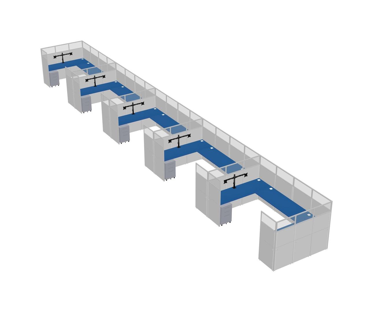 Prism Blue U-shaped Panel System For 5 Person + Monitor Arm (double Arms) + Metal Mobile Drawers For 5 User(s)