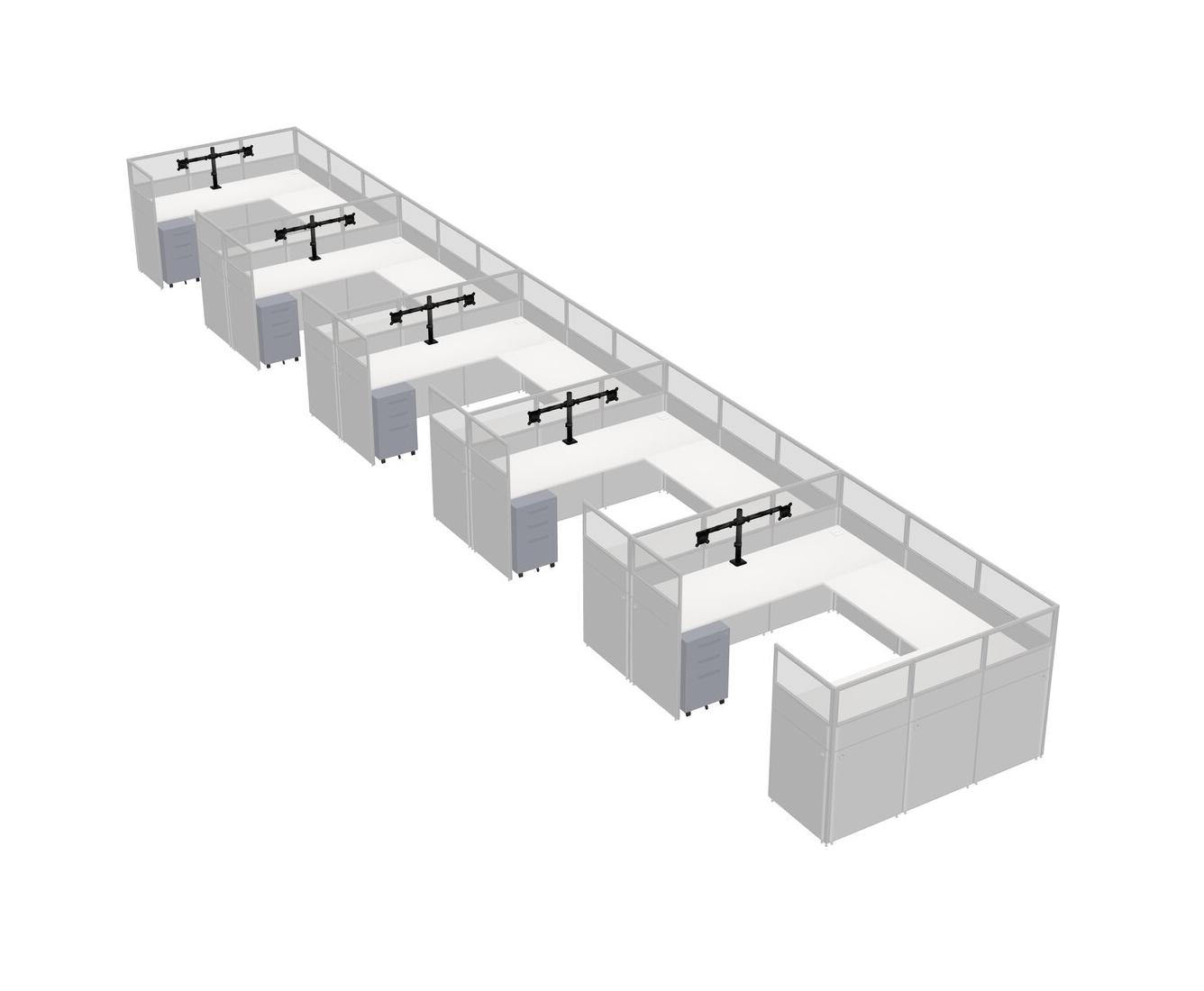 White U-shaped Panel System For 5 Person + Monitor Arm (double Arms) + Metal Mobile Drawers For 5 User(s)
