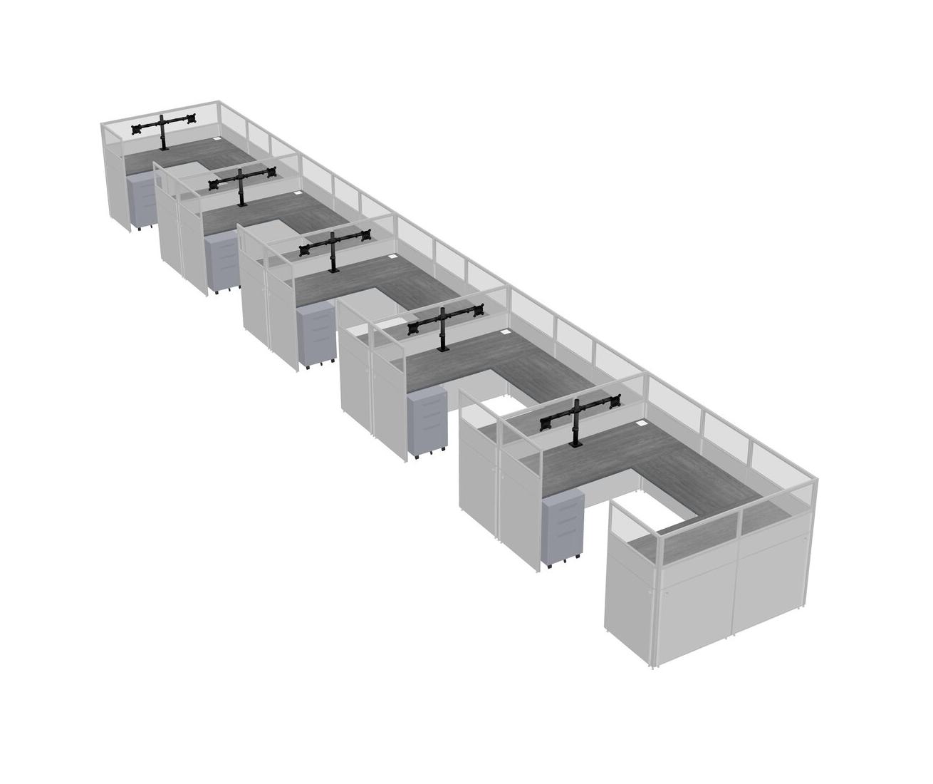 Grey U-shaped Panel System For 5 Person + Monitor Arm (double Arms) + Metal Mobile Drawers For 5 User(s)