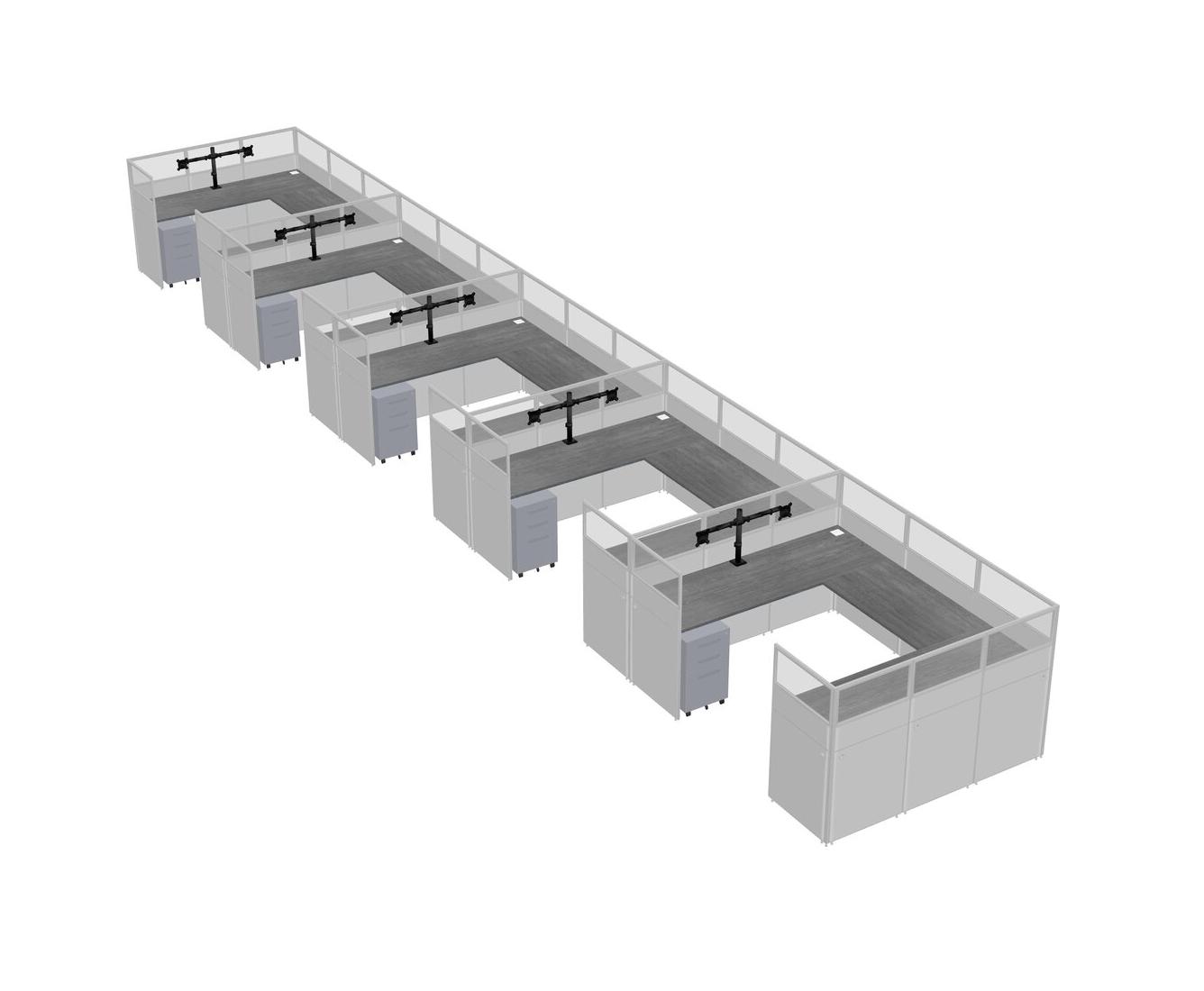 Grey U-shaped Panel System For 5 Person + Monitor Arm (double Arms) + Metal Mobile Drawers For 5 User(s)