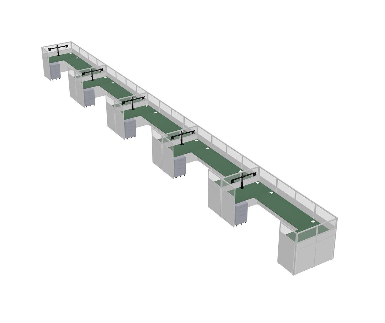Green U-shaped Panel System For 5 Person + Monitor Arm (double Arms) + Metal Mobile Drawers For 5 User(s)