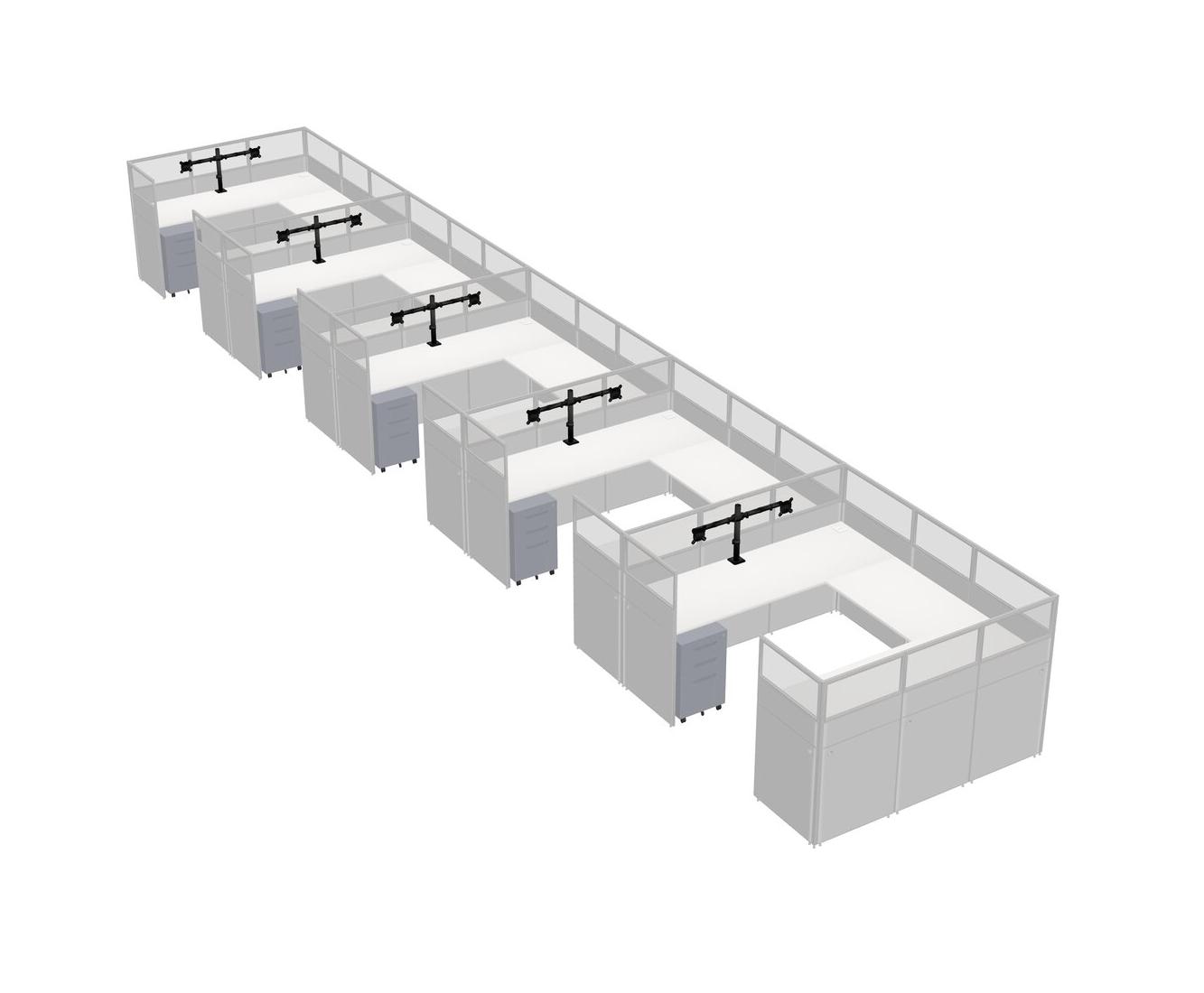 White U-shaped Panel System For 5 Person + Monitor Arm (double Arms) + Metal Mobile Drawers For 5 User(s)