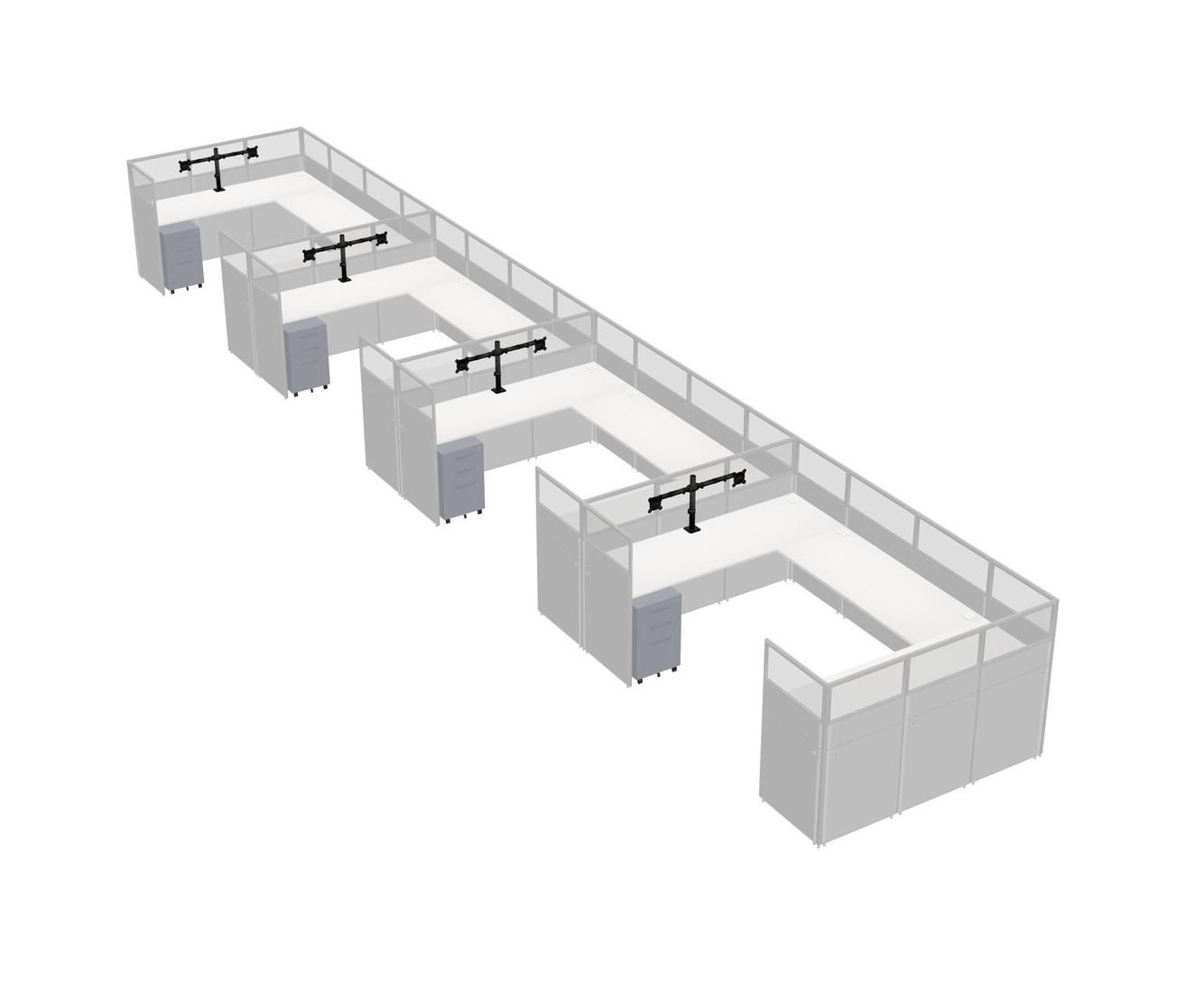 White U-shaped Panel System For 4 Person + Monitor Arm (double Arms) + Metal Mobile Drawers For 4 User(s)