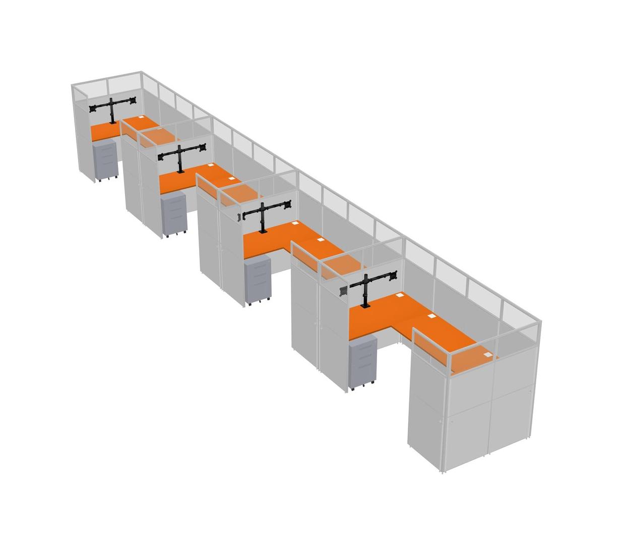 Orange U-shaped Panel System For 4 Person + Monitor Arm (double Arms) + Metal Mobile Drawers For 4 User(s)