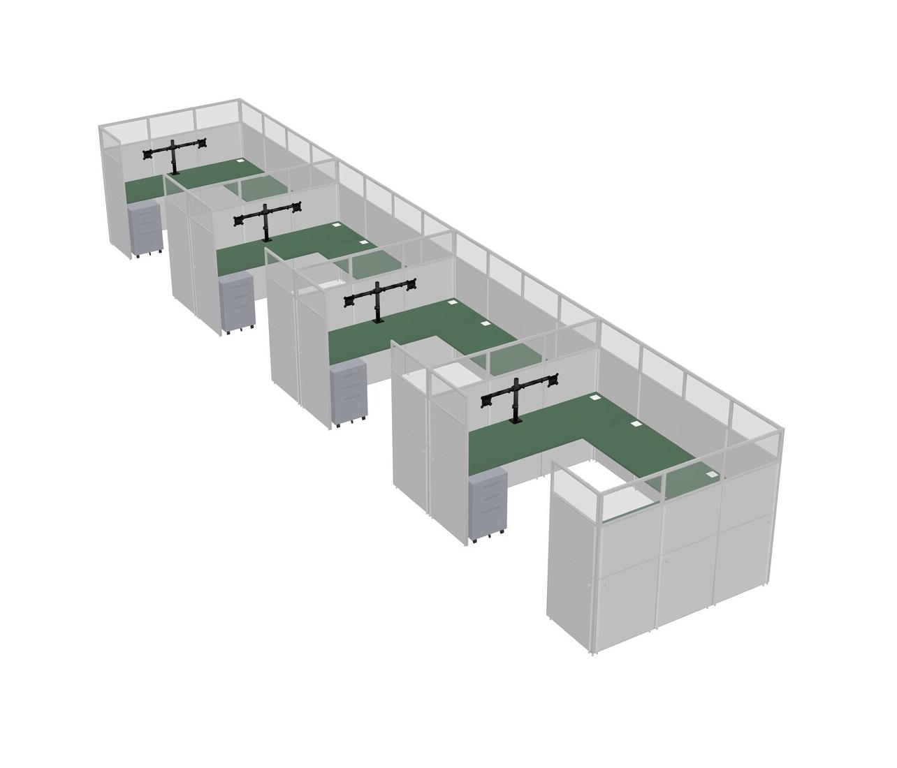 Green U-shaped Panel System For 4 Person + Monitor Arm (double Arms) + Metal Mobile Drawers For 4 User(s)