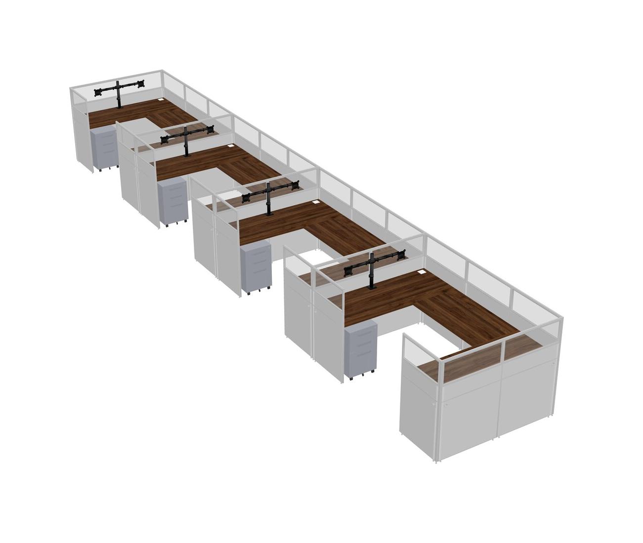 Columbia Walnut U-shaped Panel System For 4 Person + Monitor Arm (double Arms) + Metal Mobile Drawers For 4 User(s)