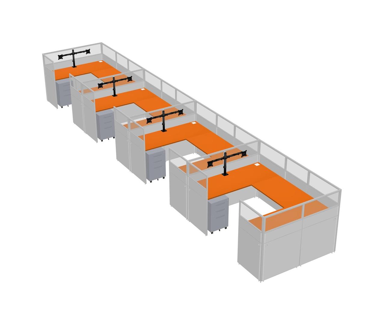 Orange U-shaped Panel System For 4 Person + Monitor Arm (double Arms) + Metal Mobile Drawers For 4 User(s)