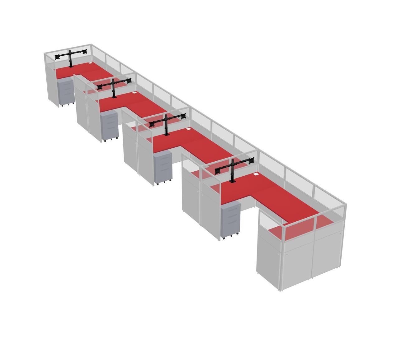 Prism Red U-shaped Panel System For 4 Person + Monitor Arm (double Arms) + Metal Mobile Drawers For 4 User(s)