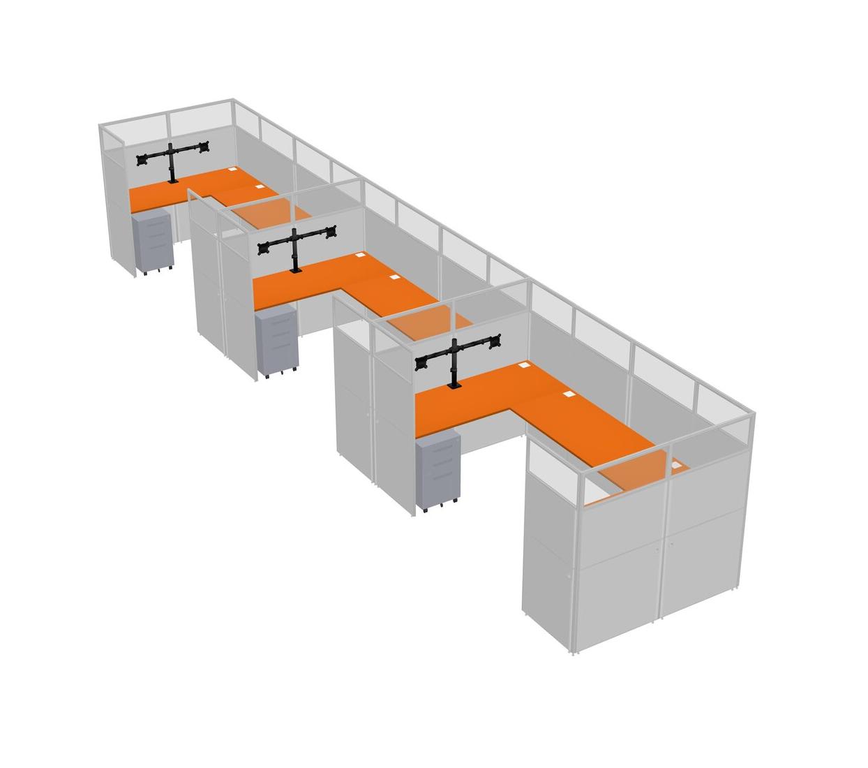 Orange U-shaped Panel System For 3 Person + Monitor Arm (double Arms) + Metal Mobile Drawers For 3 User(s)