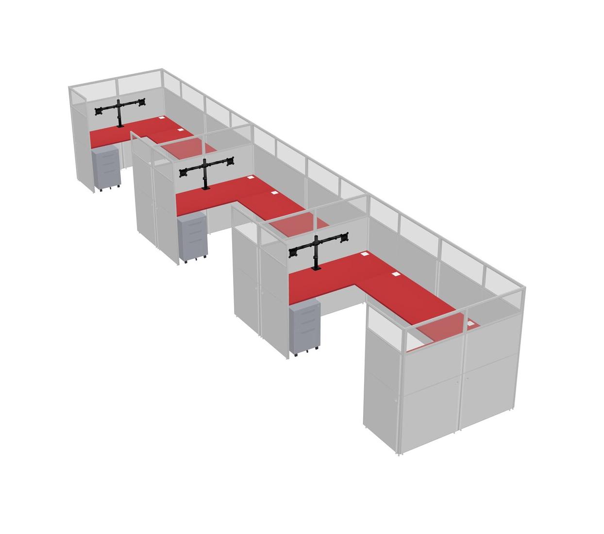 Prism Red U-shaped Panel System For 3 Person + Monitor Arm (double Arms) + Metal Mobile Drawers For 3 User(s)