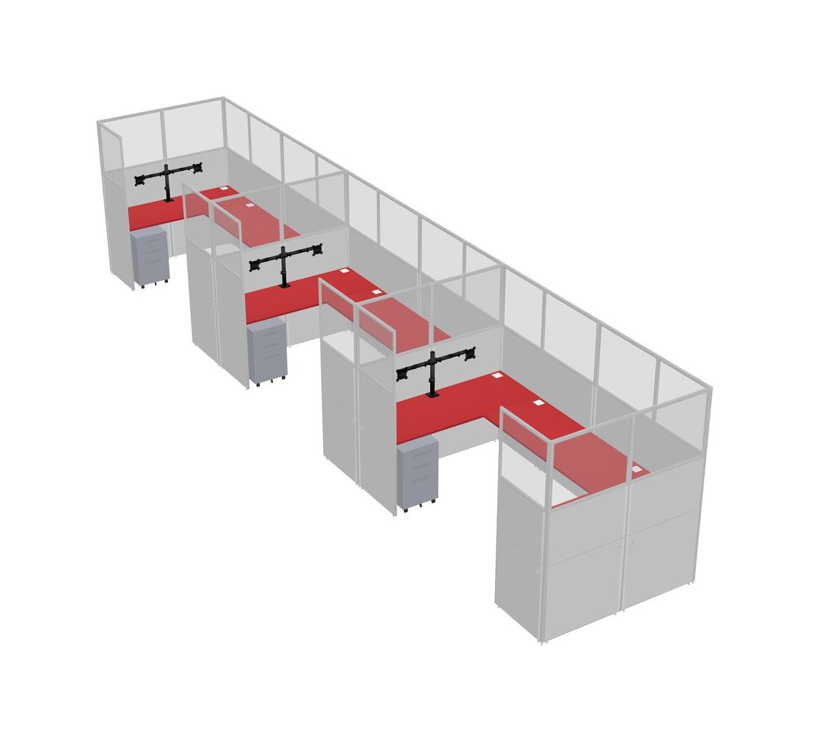 Prism Red U-shaped Panel System For 3 Person + Monitor Arm (double Arms) + Metal Mobile Drawers For 3 User(s)