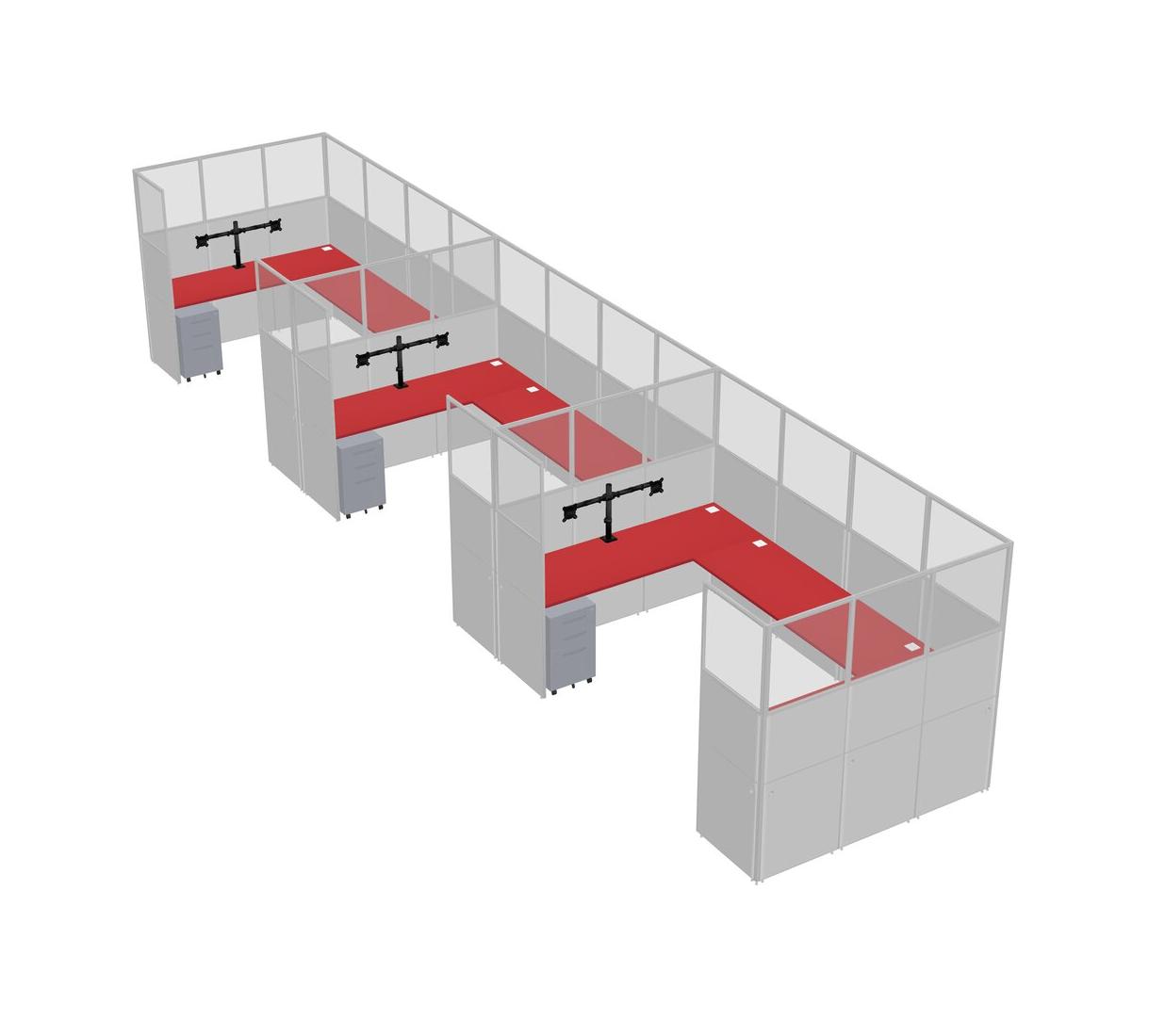 Prism Red U-shaped Panel System For 3 Person + Monitor Arm (double Arms) + Metal Mobile Drawers For 3 User(s)