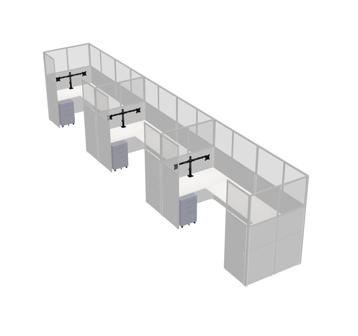 White U-shaped Panel System For 3 Person + Monitor Arm (double Arms) + Metal Mobile Drawers For 3 User(s)