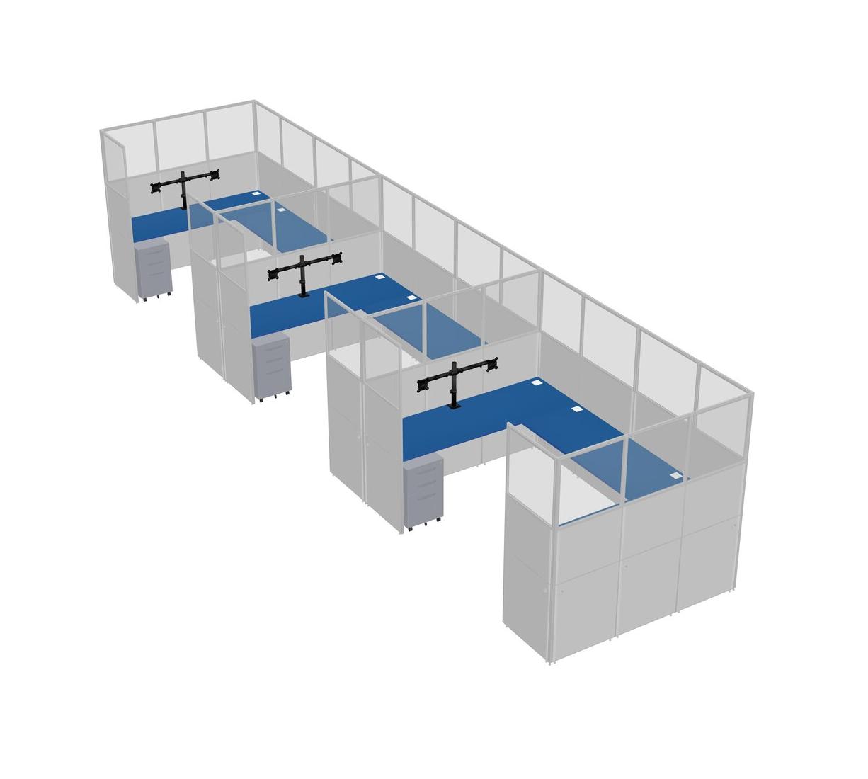 Prism Blue U-shaped Panel System For 3 Person + Monitor Arm (double Arms) + Metal Mobile Drawers For 3 User(s)