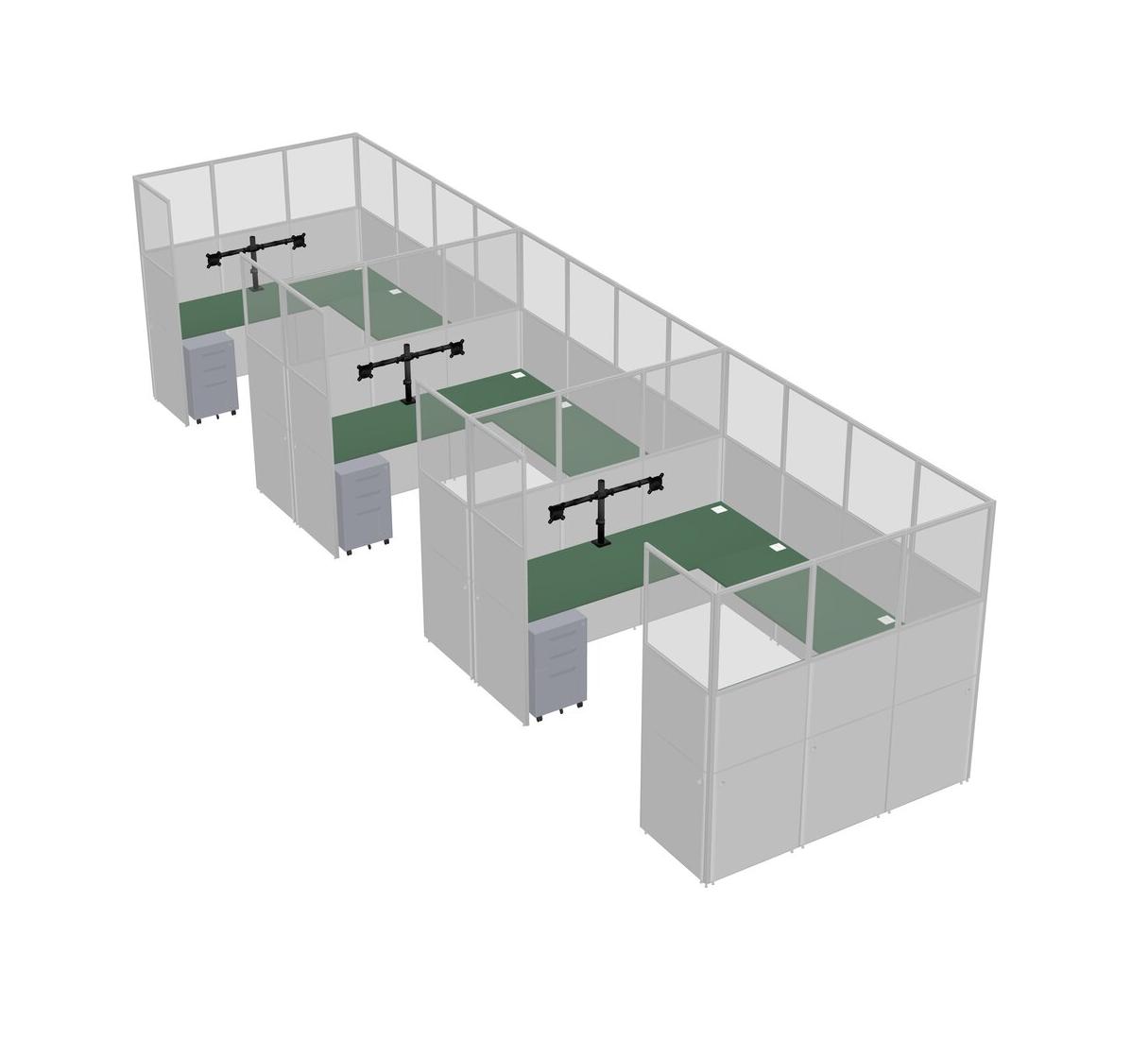 Green U-shaped Panel System For 3 Person + Monitor Arm (double Arms) + Metal Mobile Drawers For 3 User(s)